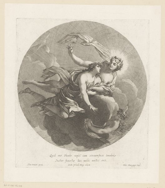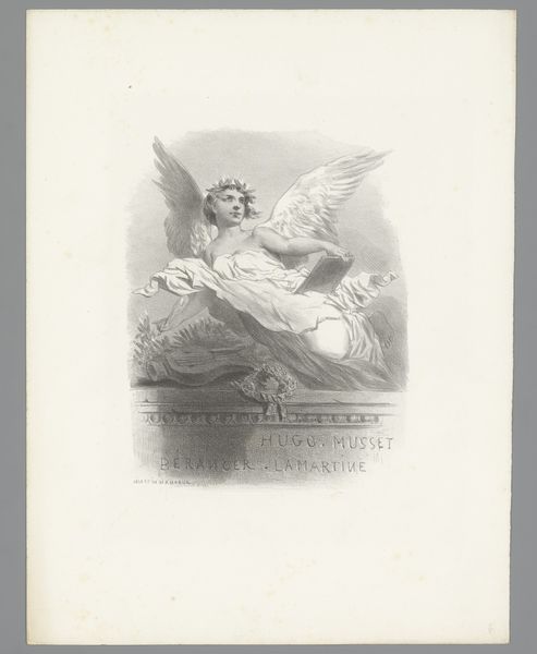 Editor: Here we have Hyacinthe Aubry-Lecomte's 1846 pencil drawing, "Studie begeleidt Genius," or "Study Guides Genius". The texture is fascinating; I'm immediately drawn to the almost photorealistic rendering achieved with just pencil. How does this piece strike you? Curator: Well, let’s consider the context. The artwork's materials—pencil on paper—belie the ambition of its allegorical subject. Notice how Aubry-Lecomte utilizes what appears to be humble materials to evoke such grandiose themes. Are we really only considering a high-minded concept, or rather labor invested through time, graphite and paper? The mass consumption of such ideas is perhaps enabled and also challenged, with a drawing produced laboriously with just one skilled artisan's hand. What would it mean for genius to need 'study', too? Editor: That’s an interesting perspective. I hadn't thought about the contrast between the medium's accessibility and the seemingly inaccessible concept of 'genius'. The nudity is striking as well, although I would presume allegories allow such things. Is there anything interesting to consider with respect to that, with relation to process or medium? Curator: Precisely. How does the labor of crafting the nude figure – labor itself perhaps seen as vulgar - elevate the social status or moral virtue of genius, which appears inherently elite. It almost turns the very definition on its head! Perhaps also, the easy accessibility and affordability of a pencil drawing - if purchased at scale as an illustration- belies its value, making the actual labour behind such things go unobserved. Editor: So, looking at the art-making process reveals potential class commentary in the way "Genius" and "Study" are constructed through labour and consumption... Fascinating. It gives new meaning to the concept itself. Thanks! Curator: Indeed, thinking about material conditions really adds new layers of interpretation, and makes us question assumptions.