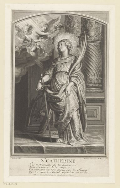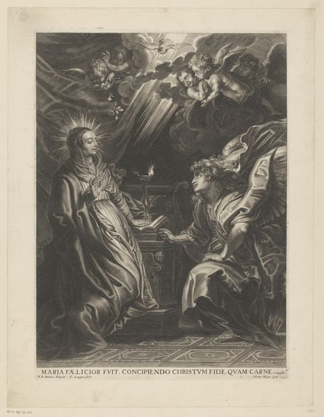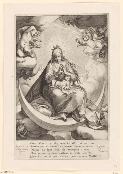 Editor: This is Cornelis Bloemaert's "Madonna and Child in the Clouds," made in 1611. It’s an engraving, so the lines are incredibly precise. The Virgin Mary looks so serene, surrounded by cherubs. What significance do you see in this visual representation? Curator: Observe how the Madonna is framed within a radiant mandorla, studded with stars. Think about what stars symbolize: divine guidance, celestial realms, but also navigation, fate. How might that interplay with the role of Mary, especially in the context of the 17th century? Editor: That’s interesting! I was so focused on the religious aspect I didn’t think about the navigational aspect. So it connects faith with earthly understanding? Curator: Precisely! The clouds beneath her aren't simply decorative; they suggest transcendence, yes, but also obscurity. Do you think it may point to an in-between space between human and divine knowledge? Look too at Mary’s downcast gaze and delicate hand gesture—do you think it hints at contemplation, humility, or maybe something more? Editor: I see what you mean about the in-between space! It seems the artist may have subtly layered a tension between certainty and doubt. The detail of line captures Mary so gentle. Thank you for pointing that out. Curator: These symbolic renderings tap into our collective understanding and aspirations. Considering historical understanding offers depth when viewing these visual cues and symbols. What will you remember when you see similar use of symbols, line, and tone? Editor: To appreciate symbolic interpretations within their particular contexts, allowing them to teach about how historical audiences have sought answers in images.
