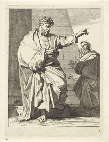 Curator: At first glance, this piece gives off the impression of a stage, perhaps during intermission. It has this quiet energy. Editor: Precisely. Let’s delve into this enchanting piece titled "Homer," an etching crafted in 1813 by J.F. Clemens. Curator: You say "etching," I see layers of time and classical ideals mingling together. It almost whispers tales of forgotten heroes and long-lost knowledge. The stark monochrome makes me wonder about truth versus presentation, particularly for Homer. He wasn't composing with a lyre here. Editor: You bring up a compelling point! In Neoclassical fashion, Clemens isn't just portraying Homer but invoking the essence of the 'idea' of Homer as a cornerstone of Western literature. Consider the lyre as an emblem, a signifier of epic poetry, complemented by that solemn backdrop featuring both column and bust fragments, setting the stage, quite literally. Curator: Absolutely, it’s the classical packaging, but I sense more. The presence of a spear feels jarring against his bard's instrument; as though conflicting, they suggest some heroic connection as well as inner turmoil. Do we need to consider how historical elements intersect with human vulnerability to see the portrait's complexity more? Editor: An insightful parallel! What resonates profoundly is its function as more than just a likeness; this portrayal invokes centuries worth of historical interpretation and veneration for cultural continuity—Homer isn't just some man, he represents an entire tradition. Curator: Yes, looking closer at this work as a matrix, you know… each strike of the etcher’s needle builds up not only shape and figure, it lays down cultural history like sediments. What you called classical tradition might mean a canon that also carries both glory and pressure in this picture. Editor: A perfect conclusion—it seems within this quiet etching stirs much conversation; through symbolic gestures within the visual representation itself we discern entire literary-historic narratives. Curator: Definitely something that holds lasting significance. The work encapsulates entire ages of respect and thoughtful scrutiny within an ostensibly "simple" portrayal!