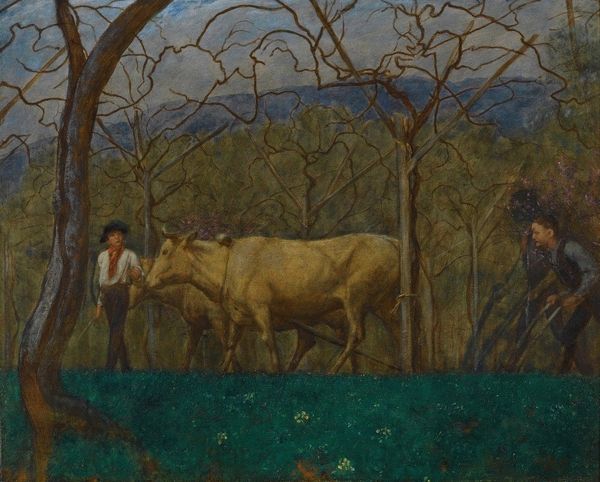 Edward Mitchell Bannister created "Herdsmen with Cows" using oil paint. The muted palette, dominated by browns and greens, immediately evokes a sense of rural tranquility. The composition is carefully structured, with the strong horizontal line of the earth grounding the scene. Bannister’s engagement with form extends beyond mere representation, inviting us to consider the painting's deeper cultural resonances. The texture of the earth and the musculature of the cows are rendered with visible brushstrokes. This emphasizes the materiality of the painting and the physical labor it depicts. The herdsmen and the landscape elements are placed with a structuralist view to emphasize nature. The subdued tonal range and tactile surface encourage a contemplative viewing experience, highlighting Bannister's formal concerns with light, texture, and form, inviting viewers to reflect on the historical and cultural contexts that shaped both the artwork and its reception.