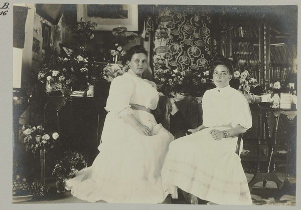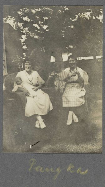 Hendrik Herman van den Berg created this small-scale photograph, "Portret van Annie en Lily Holle," capturing two women in an outdoor setting. The sepia tones evoke a sense of nostalgia, softened by the diffused light, creating a gentle, almost dreamlike quality. The composition is divided into distinct horizontal bands: the dark foreground of grass leads to the figures of Annie and Lily, dressed in light-colored gowns, set against a backdrop of lush greenery and the blurred facade of a building. The placement of the women, close together and centrally located, emphasizes their relationship, underscored by their mirroring poses. The limited tonal range reduces details to simple forms. The photograph's strength lies in its ability to convey a mood through the interplay of light and shadow. Van den Berg uses the formal constraints of photography to capture a moment, hinting at the social codes and the aesthetic preferences of its time. Rather than a precise record, this image serves as an exploration into capturing an atmosphere.