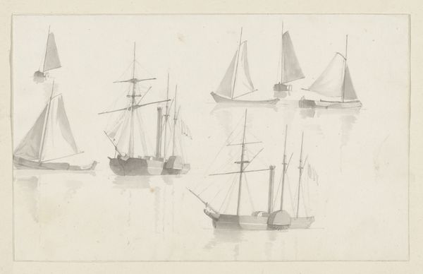 Curator: Before us is Richard Parkes Bonington's "Boats in a Harbor," circa 1824. It's a beautiful example of his work in watercolor and graphite on paper, held right here at The Art Institute of Chicago. What strikes you initially about it? Editor: It feels almost dreamlike. The soft, sepia tones create a sense of stillness, of a moment suspended in time. It evokes a very specific type of nostalgia. Curator: Absolutely. Bonington, often associated with Romanticism, was working within a time of great social upheaval. Looking closer, the maritime setting becomes relevant. The presence of boats can represent transportation, not just of goods but also of people and ideas. Maritime activity, for many in the working class, held a prominent presence. Editor: It does conjure a specific sense of the passage. Water is such a loaded symbol – both a source of life and a perilous, unknowable space. And the boats themselves…each carrying stories. I'm curious about the cultural significance of the sails, their shapes like yearning arms, what do you see when observing them? Curator: They evoke both possibility and constraint. Bonington’s technique adds another layer to this meaning, these very subtle outlines, the muted palette. I wonder if this lack of boldness represents the limitations for the majority compared to wealthy sea merchants and shipbuilders? I can’t help but interpret the limited color usage through a social lens, seeing them as representative of muted and limited prospects. Editor: Interesting. From an iconographic viewpoint, these vessels, suspended between clarity and obscurity, may be representative of Bonington and many like him existing betwixt Romanticism and the shifting landscape of the Industrial Revolution. Curator: It truly makes us think. Bonington does not present us with grand heroic ships that cut boldly through a shining sea. Rather, it is a tranquil harbor scene infused with longing, existing, you're right, in an uncertain space. A transient moment made permanent. Editor: Yes, and perhaps it is that tension, that visual pause, that resonates so strongly across centuries. It's in his depiction, Bonington memorializes our relationship with water, with ships and what it is that maritime trade symbolizes at large. What a sublime study! Curator: Absolutely. A reminder of the beautiful ways in which art intersects with broader societal narratives and personal stories. Thank you.