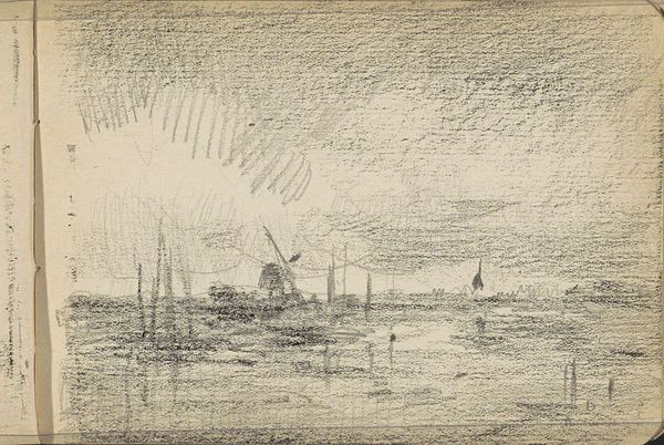 Jozef Israëls created this landscape with water using black chalk, exploring a scene dominated by the interplay of light and shadow. The composition appears almost monochromatic, with varying densities of chalk strokes defining the forms. Notice how Israëls uses hatching and cross-hatching to build up the tonal values, creating depth and texture. The darker areas, massed with intense marks, suggest solidity and weight, while lighter, sketchier strokes evoke a sense of airiness and movement. The horizontal orientation of the drawing and the dominant, broken horizon line divide the composition into distinct zones, each contributing to the overall atmospheric effect. This formal arrangement is not merely descriptive; it embodies a psychological landscape. The lack of sharp detail and the prevalence of tonal ambiguity may challenge the traditional representational values. Instead, it invites viewers to contemplate the subjective experience of landscape. It uses the formal properties of the medium itself to explore the shifting and unstable nature of perception.