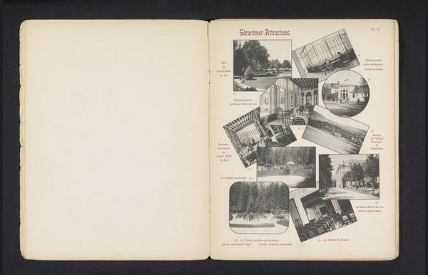 Editor: Here we have “Acht plekken in de omgeving van de Col de la Schlucht,” or "Eight Places in the Col de la Schlucht Area," created before 1898 by A. Thiriat, presented as a print incorporating photography. It strikes me as a kind of early tourist brochure. What’s your perspective on it? Curator: From a materialist viewpoint, this print offers a glimpse into the commodification of leisure and landscape. Look at how photography, as a relatively new medium, is employed. The assembly-line, the reproducibility. It's not about artistic expression here, at least not primarily. Editor: So, it's more about mass production and accessibility? Curator: Exactly. Each individual photo depicts scenic viewpoints. But, crucially, consider the print as an object, an artifact born from the processes of photographic printing and bookbinding. It's designed for consumption, for those who can afford travel. Tourism creates jobs, transforms environments… It highlights a changing society through labour. What do you notice in the contrast between the printed text and the photographic image? Editor: Well, the text seems almost like captions or advertising, whereas the images provide the… proof, the reality of the places being described. It’s definitely about selling a place and an experience. Curator: Precisely. Now consider how that experience might be different depending on one’s social status. The consumption of art, and the land shown here, became stratified along similar lines. It begs the question of whether photography here democratizes image-making, or extends elitism in capturing scenes others might never witness in person. Editor: I see how this connects to broader themes of industrialization and access. It's not just about the beauty of nature. Curator: No, it reveals a great deal about the industry around beauty. Editor: Thank you, that’s a fantastic perspective. I never thought about tourism as part of visual culture itself!