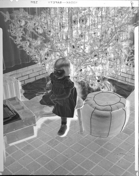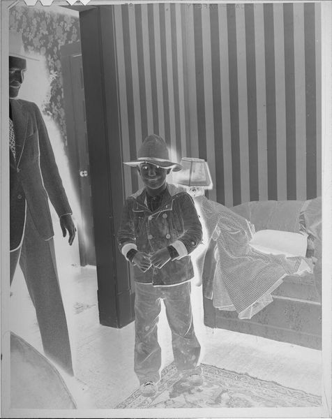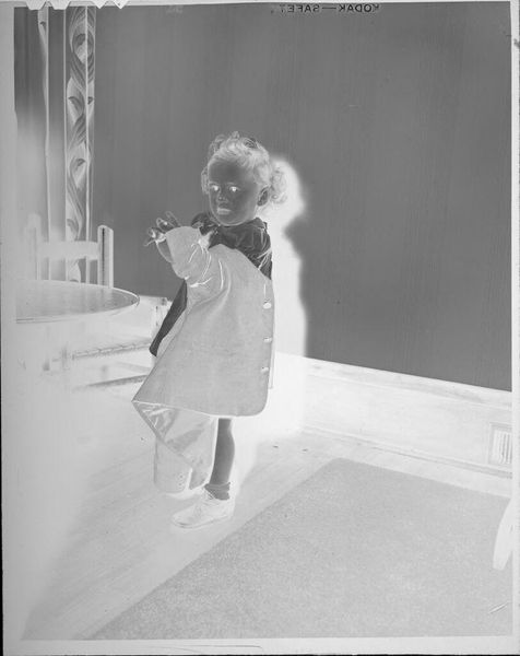Editor: This is an Untitled photograph from an unknown date by Lucian and Mary Brown, picturing a boy holding balloons. The high contrast and composition feel stark, almost unsettling. What strikes you when you look at it? Curator: The inversion of light and shadow immediately disrupts conventional photographic expectations, doesn't it? Observe how the tonal reversal affects our perception of form and texture. The balloons become dark, almost ominous shapes. Editor: Ominous, that's a great way to describe it. So, you're focusing on the abstract qualities first? Curator: Precisely. Consider how the stark geometry of the window frame and the contrasting textures of the curtain and tiled floor contribute to the overall visual tension. The arrangement is deliberately disorienting. Editor: I see it now. It's less about the boy and more about the relationships between the shapes and tones. Curator: Exactly. By manipulating these elements, the artists invite us to question the very nature of photographic representation. Editor: I've definitely learned to look beyond the subject and consider the artistic choices. Curator: And that is the beginning of understanding.