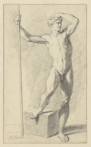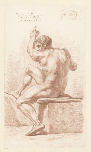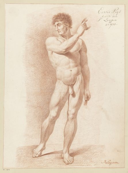 Curator: Here we have "Standing Male Nude, Seen from the Side (1st prize 1773)" by Johannes van Dregt, likely completed in 1773. It’s currently held at the Rijksmuseum. Editor: My initial reaction is a feeling of intense academic study. The pose is classical, almost sculptural, but rendered with a striking focus on anatomical precision using red chalk. Curator: Absolutely. Van Dregt’s drawing exemplifies the academic training of the period. Nude studies were central to artistic education, emphasizing understanding human anatomy through direct observation and meticulous rendering. We must also recall that academic art served powerful cultural functions beyond mere representation, acting as visible markers of status and skill. Editor: And you see it in the very distinct, even laborious application of the chalk. Look at the build-up of layers to define the musculature. The drawing highlights not just skill, but the labour involved in acquiring that skill. It's as much about showing the artistic process as the finished figure. What’s really interesting is thinking about where he sourced this very particular type of chalk; it is integral to how the piece communicates artistic value. Curator: The "1st Prize 1773" inscribed on the drawing immediately points us to its original context: an art academy. Prizes such as these fostered competition, promoting adherence to established stylistic norms and solidifying hierarchies within the art world. It speaks to the institutional forces shaping artistic production at the time. Editor: Precisely. The material choice, coupled with that inscription, becomes part of the piece's inherent message about achieving perfection through learned practices. This approach definitely blurs lines between 'high art' and the labour needed to produce that form. Curator: Indeed, seeing art in a historical context allows us to appreciate these intertwined narratives of institutional validation and artistic merit. Editor: And considering it through a materialist lens gives a heightened awareness of process, skill and making, revealing a dense, and even layered significance to the art object.