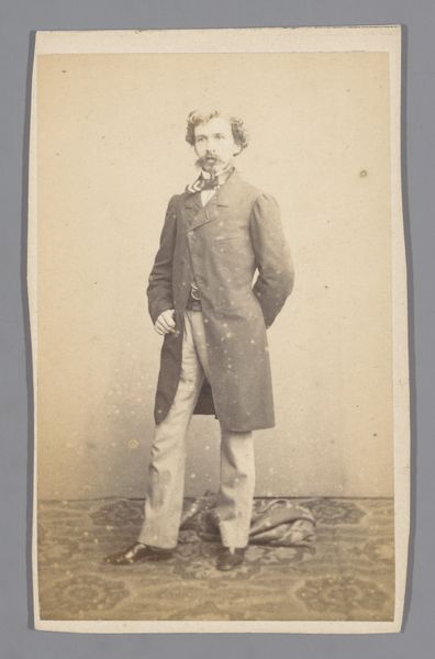 This photograph captures Eugène François de Block, a painter, in an intimate, full-length portrait. Note the subject's hand gently placed inside his coat, a gesture laden with complex connotations. It echoes across centuries, from depictions of emperors and military leaders asserting authority, to symbols of inner turmoil and contemplation as seen in Romantic-era portraits. Think of Napoleon, often portrayed with a similar gesture, exuding confidence and control. Yet, here, the same gesture seems to convey a more subdued, almost melancholic air. Consider how such a seemingly simple gesture can accumulate layers of meaning through its repetition in art history. It becomes a visual echo, resonating with past associations, yet subtly altered by the sitter's demeanor and the context of the portrait. This is no longer merely a pose, but a convergence of history and emotion, engaging us on a deep, subconscious level. The gesture resurfaces, evolves, and takes on new meanings, connecting us to a broader tapestry of human expression.