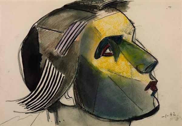 Editor: So, this is Marc Chagall's *Esquisse pour l’affiche ‘Le ciel Bleu’ ou Profils vert et orange*, a mixed-media piece from around 1964, incorporating ink, watercolor, and painting techniques. The juxtaposition of the floating figures against the landscape creates such a dreamlike, almost melancholic feel for me. What do you see in this piece? Curator: Dreamlike is spot-on. Notice the color choices for the profiles: green and orange, colors associated with vitality and warmth, but presented almost as masks. They evoke, for me, a tension between inner emotion and outward presentation. The 'Blue Sky' it was advertising—how might those fragmented landscapes and figures speak to a deeper longing? Editor: That tension is really interesting, like a disconnect between the self and the world. How do the other symbolic components influence the overall impact? Curator: Look at how the figures almost emerge from the background, intertwined with the foliage. It mirrors the Expressionist idea of externalizing the internal—the landscape reflecting emotional states. What of the bridge, or city near the water, toward the lower part of the artwork? How might they factor in? Editor: I suppose that connects to Chagall's exploration of memory and place… almost as though these locations, these symbolic components, create an amalgamation of memory itself? Curator: Precisely! They become visual signifiers, resonant with personal and cultural histories. These weren’t merely depictions but charged symbols imbued with the artist’s experience and identity, made accessible by those vivid yet sometimes clashing colors. A fragmented identity reflecting a shifting, fractured world perhaps? Editor: I never would have considered that these elements aren't simply representational, but are almost characters themselves. Curator: Indeed. Art at its most impactful reveals multiple layers and meanings upon close inspection, connecting to culture and our emotional state. I feel my understanding has certainly deepened.