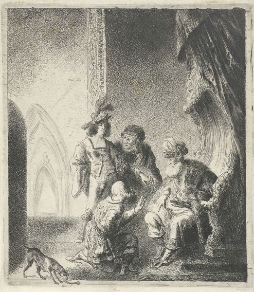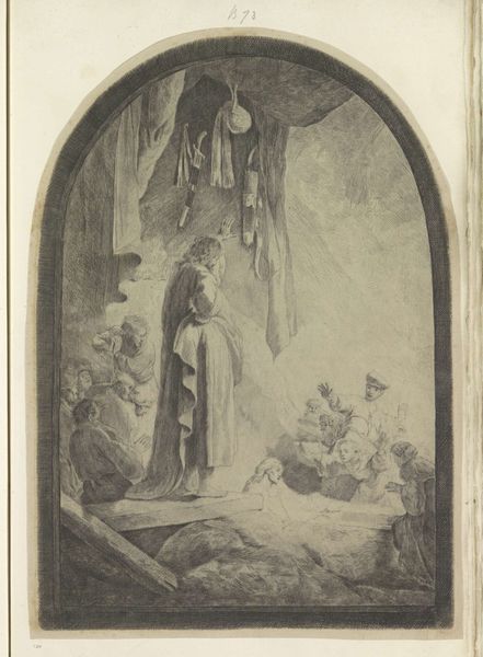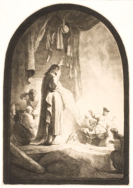 Editor: Here we have Rembrandt van Rijn's etching, "The Raising of Lazarus," from about 1632, currently residing at the Minneapolis Institute of Art. The sheer dramatic tension created by the stark contrast of light and shadow is overwhelming. What do you see as key to understanding this work? Curator: Indeed, the masterful manipulation of light, the chiaroscuro, is structurally fundamental. Note how the light doesn't just illuminate, it models form, creating volume and depth. Consider the expressive power inherent in the linear quality of the etching itself; the artist modulates line thickness to signify spatial recession. Do you observe how the composition is spatially organized and how the figures interact within that space? Editor: Yes, I see how Lazarus and Jesus are on almost opposite sides of the picture frame. Lazarus seems to push forward, with Jesus set back along the left. Is this a deliberate choice in arrangement and distribution? Curator: Precisely. This structural binary divides the earthly and divine. The arrangement isn't just a compositional choice, it creates a framework for thematic reading. What we interpret comes from a comprehensive appreciation for all details, how the distribution of shade forms value. Editor: So, beyond the story itself, focusing on the artistic elements of line, composition, and light helps us to truly decode Rembrandt's intention. Curator: Indeed. Art, after all, speaks most eloquently through its form. Editor: Thank you, I'll keep that in mind when assessing paintings in the future.