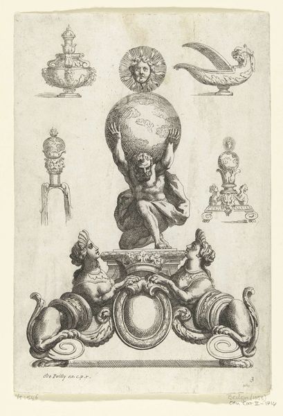 This print, made by Jean Cotelle in Paris, showcases designs for metalwork, specifically andirons - those metal supports for logs in a fireplace. The technique used here is engraving, where lines are cut into a metal plate, inked, and then printed onto paper. Notice the intricate details of the designs, from the cherubic figures to the floral garlands, and the grotesque masks. The image gives us insight into the artistic and skilled traditions required to produce luxury metalwork during that time. Prints like this one played a crucial role in disseminating designs and driving consumption. They allowed artisans and patrons to visualize and select the latest styles, influencing the production of decorative arts across Europe. The very existence of this print highlights the rising importance of design as a commodity. It reminds us that even seemingly functional objects were laden with cultural significance and symbolic value.