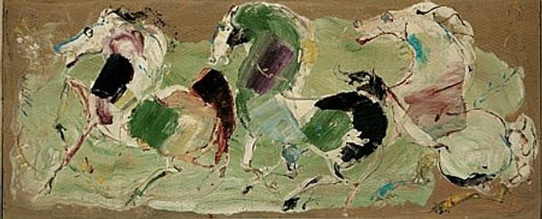 Giuseppe Pinot-Gallizio created this enigmatic work entitled 'The Siren and the Pirate' with what seems to be an evocative, gestural language. Here, the siren, traditionally a symbol of temptation and peril, engages with the pirate. This archetypal figure is a symbol of rebellion, freedom, but also lawlessness. Their interaction suggests a complex interplay of attraction and danger. We can trace the siren's lineage back to ancient Greek mythology, where she lured sailors to their doom with irresistible song. The emotional depth in Pinot-Gallizio's piece lies in the way it connects to the collective unconscious. This speaks to the human psyche's timeless struggles with desire, control, and the unknown. Just as the siren's song has echoed through the ages, so too do our primal instincts continue to resonate. Symbols transform, but their underlying power persists. The dance between the siren and the pirate is forever inscribed in our cultural memory, evolving and resurfacing in new guises across the epochs.