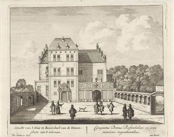 Hendrik Spilman created this print titled "Gezicht op slot Zeist" sometime in the 18th century. Spilman, who lived from 1721 to 1784, was working in a Dutch society shaped by the legacy of its Golden Age, but also experiencing internal socio-political tensions. This meticulously rendered image of Zeist Castle isn't just a neutral depiction; it's an assertion of power and status. Note the figures in the foreground, dwarfed by the scale of the building. They emphasize the wealth and authority associated with the castle, reflecting a society deeply structured by class divisions. The castle stands as a physical embodiment of the elite, a reminder of their dominance. Spilman's print invites us to consider whose stories are being told and whose are being omitted. What about the lives of those who maintained the estate? What were their experiences within these grounds? While Spilman’s work is a beautiful example of 18th century Dutch printmaking, it also serves as a potent symbol of the era’s social hierarchies.