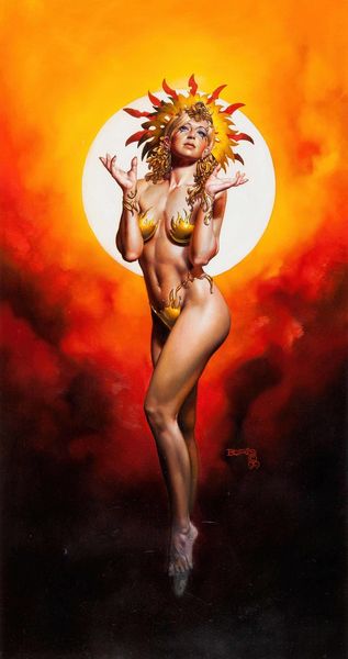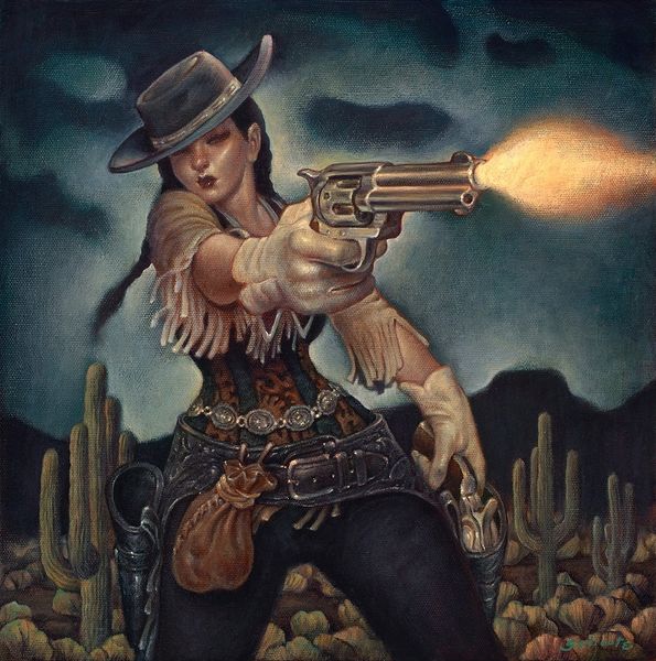 Victor Prezio’s "The Naked Belly Dancer" depicts a dramatic scene where a figure, presumably a belly dancer, stands against a backdrop reminiscent of a full moon, while a soldier points a weapon at her. The full moon is a timeless symbol laden with meanings—fertility, cycles, and the passage of time. Consider how the moon's glow is transposed onto the sacred feminine and how Prezio utilizes it here. The moon, in its celestial dance, has been linked to madness, dreams, and the subconscious. The dancer's pose echoes ancient depictions of ecstasy and vulnerability, reminiscent of maenads dancing in a frenzy to Dionysus. The soldier is a symbol of power and control, seemingly threatening the dancer's sensual freedom. This juxtaposition brings to mind the dance of life and death. A cycle of human experiences is presented through these characters that have been echoed and resurfaced in different contexts, now evolving to take on new meanings in a contemporary context.