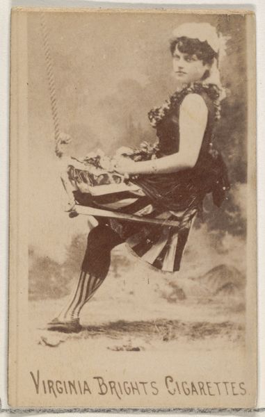Curator: Here we have an albumen print titled "Miss Wilson, from the Actresses series," created in 1889 by William S. Kimball & Company. It’s a rather petite piece. Any immediate thoughts? Editor: Well, first blush? It's giving me vaguely surreal Edwardian theatre vibes mashed up with an anime schoolgirl. The sepia tones really give it a haunting, dreamlike quality, almost as if you were seeing her picture floating in amber. Curator: The Actresses series was distributed as part of a marketing campaign. Think of it—these were essentially collectibles inserted into cigarette packs. Tobacco companies leveraged popular actresses to sell their products and, consequently, reinforced certain ideals of beauty and celebrity. Editor: Oh, it's pure commerce then! It reminds me how the 'perfect image' always gets packaged and sold. It's interesting what they chose to depict - she looks like a strange blend of a geisha, a schoolgirl, and a vaguely Grecian statue. Almost as if it’s every fantasy all mashed into one little photograph! Curator: Indeed! The print shows a nod towards Japonisme with the stylistic use of shape and decorative elements of dress. But the commodification is key here; Kimball wasn't just selling cigarettes, they were selling aspirations. Editor: Aspirations and maybe a little escape! I mean, look at the soft-focus backdrop—it’s like a theatrical set. Everything’s a performance! It asks, what did Miss Wilson, this 'ideal', mean to the consumer then and now? What smokescreen is this trying to draw us into? Curator: Exactly. Advertising intertwines commerce, public image, and these popular notions of art. What began as promotional material provides us insight into cultural and social values during the late 19th century. Editor: Yeah, it really gives you pause to consider all the messages—both seen and unseen—in our modern advertising campaigns. Like, what little trinket in your bag of potato chips is rewriting society's ideas of beauty today? Curator: It is remarkable to consider. This unassuming little piece provides such insight into its era—its aspirations and its manipulations. Editor: Well, now I’ll never look at a pack of gum the same way again! Time to go stare intensely at the wrappers and let the existential crisis sink in.
