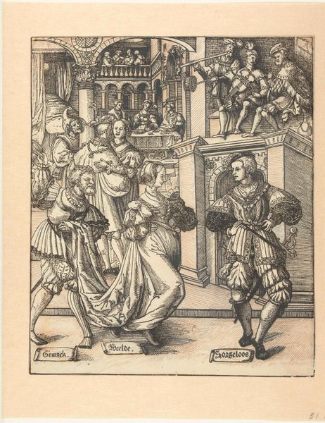 Editor: This intricate print, a woodcut rendered in ink, is called *Maximilian and Mary of Burgundy Teaching Each Other Their Languages*, made around 1512 to 1516 by Leonhard Beck. The details are amazing, capturing the clothing, architecture, and even what seems to be social interaction in such a small scale! How do you interpret this piece? Curator: Considering its historical context, this print reveals much about the social functions of art and portraiture during the Northern Renaissance. This piece not only celebrates the union of Maximilian and Mary but also serves as a form of political propaganda. Editor: Political propaganda? In a seemingly innocent scene of language exchange? Curator: Exactly! Think about it: Why depict them teaching each other languages? It's not merely a sweet gesture. It symbolizes cultural exchange and, more importantly, political alliance through marriage, a common strategy among royal families to consolidate power and secure territories. This print then circulates an idealized image of a powerful and unified couple, legitimizing their rule. Consider the socio-political environment where the Habsburgs sought to legitimize their lineage through imagery like this print. How might the general public, consuming prints like these, have been impacted? Editor: I guess I had not thought about that... it shifts the perspective from a cute domestic scene to strategic, political maneuvering! Knowing this, do you think it changes our appreciation of the art? Curator: Absolutely. It enriches our understanding of its role in society. The artist, Beck, was essentially commissioned to construct and disseminate a specific narrative, carefully managing the image of the ruling family for public consumption. Editor: It’s like the royal family carefully crafting their PR image, except using 16th century printing techniques! It's amazing to think about the intended audience and how carefully managed these images would have been. Curator: Precisely! So, understanding art requires considering who controlled its production, distribution, and reception—illuminating its political undertones.