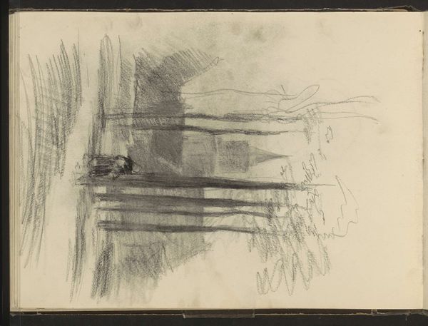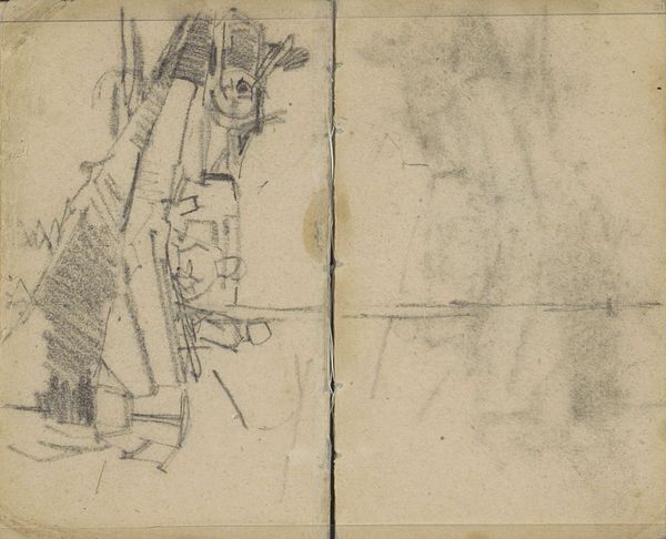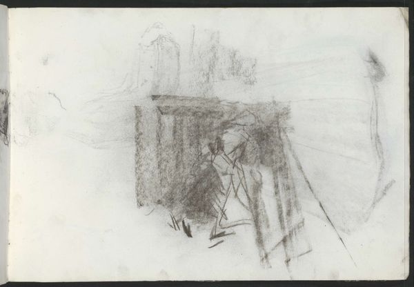 This sketch titled, Figuren voor een gebouw, waarschijnlijk in Amsterdam, was made by George Hendrik Breitner. It's a striking composition in charcoal, where Breitner captures an urban scene with bold, almost brutal strokes. On the left, we see the suggestion of architectural forms, rendered with dense, dark shading that contrasts sharply with the open space of the right page. The artist destabilizes traditional representational values, opting instead for a raw, immediate impression. Breitner's sketch engages with the semiotic function of line and form to create a sense of place. The lack of conventional perspective encourages us to question fixed meanings, pushing beyond mere depiction to explore the essence of urban experience. It prompts us to consider how sketches can function not just as preparatory studies, but as autonomous works that challenge our perceptions and expectations.