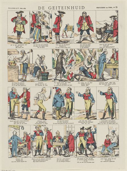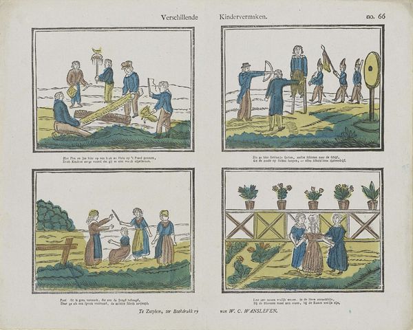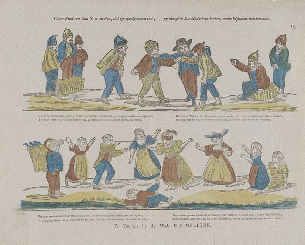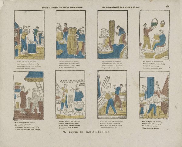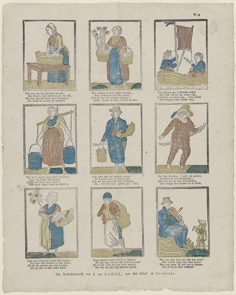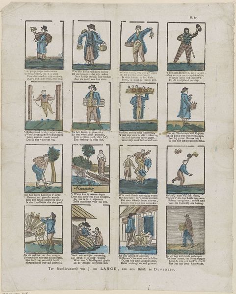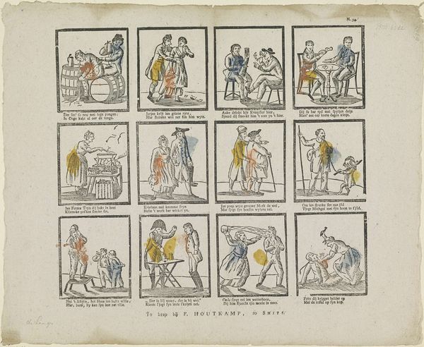 Editor: Here we have "Figuren en bezigheden," or "Figures and Activities," an etching on paper made sometime between 1828 and 1849. It almost looks like an early comic strip with all these little scenes! What can you tell us about the socio-historical context surrounding this print? Curator: This print provides a fascinating glimpse into everyday life in the Netherlands during the first half of the 19th century, a time of significant social and political change following the Napoleonic era. Prints like these served as a popular form of entertainment and communication, circulating widely amongst different social classes. How do you think its distribution impacted society? Editor: Well, the fact that they were distributed so widely must have meant the imagery influenced people's perceptions and understandings of the world. The subjects in the various scenes seem pretty mundane… Curator: Exactly! And that mundanity is key. They often presented idealized or humorous depictions of daily routines, social interactions, and moral lessons, reinforcing certain societal norms and values. Notice the inscription at the bottom; these were sold by Erve Wijsmuller, so we can infer a specific intent in disseminating particular messages. Do the themes resonate at all today, nearly two centuries later? Editor: I suppose we can still relate to depictions of socializing and even minor domestic squabbles! So this print offers a lens to examine the shared human experiences of the time? Curator: Precisely. And by studying these "Figures and Activities," we gain insight into how cultural values were propagated and consumed within Dutch society. Plus it also reveals what the average person may find relatable even now. Editor: I never thought about prints having such cultural impact before. I appreciate learning the function that art has. Curator: Likewise. These historical "snapshots" truly enhance my perspective about public art in society.