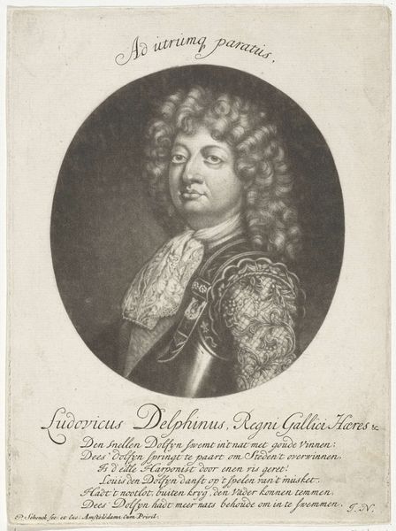 Editor: This is "Portret van Lodewijk XIV als prins" by Philibert Bouttats, made after 1664. It's a mixed-media print displayed at the Rijksmuseum. I’m struck by the elaborate frame and the formal pose. What sort of message do you think it sends? Curator: It presents a carefully constructed image of power. The elaborate dress and formal setting reflect the expectations placed upon Louis from a young age. Consider how portraiture functioned as a tool for constructing and reinforcing royal authority during the Baroque era. This wasn't just about capturing a likeness; it was about conveying the divinely ordained right to rule. Editor: So, it’s propaganda almost? To present him as regal, even as a child? Curator: Absolutely. It's crucial to analyze this image within the context of 17th-century French society, one marked by political maneuvering and religious conflict. Think about the symbolic weight of the fleur-de-lis on the crest. The print itself would have been widely circulated, reinforcing a particular vision of kingship to different social classes, influencing their understanding of power and legitimacy. Does viewing it in that context change your impression? Editor: It definitely makes me look beyond the surface-level prettiness of it all and consider the political implications. It’s kind of unsettling to see someone’s image being so carefully crafted for political gain. Curator: Precisely. This challenges us to think critically about representation and power structures that continue to operate today. How does the construction of images, especially of those in power, shape our perceptions and impact our societal narratives? Editor: That's given me a lot to think about. Thanks! Curator: Indeed, it prompts critical analysis of constructed identities, power dynamics, and the pervasive nature of visual messaging in our contemporary society as well.