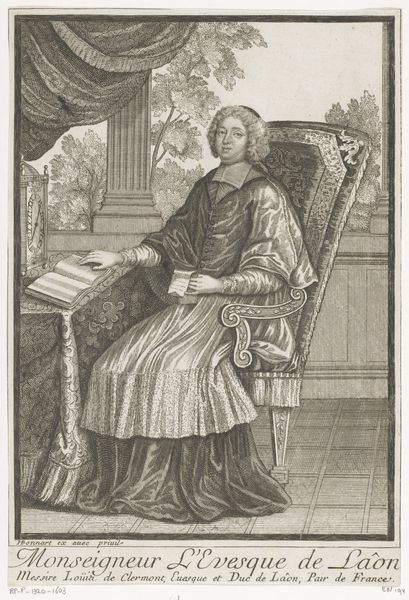 Curator: Well, what do we think of this chap, then? Editor: He looks incredibly serious, and somehow trapped—like he's been told to stand still for hours and his spirit's slowly draining. Curator: He does, doesn’t he? This engraving by Dominicus Custos depicts Joachim Ernst of Brandenburg-Ansbach at the ripe old age of twenty. It’s from sometime between 1625 and 1627, and hangs in the Rijksmuseum now. Editor: "Engraving" almost seems too delicate a word for something conveying such a somber presence. I mean, look at the ornamentation on his doublet, and that enormous ruffled collar; it almost suffocates him. All those elaborate details, and that curtain framing him? Total power play. Curator: Precisely! The piece practically screams status. And observe his attire – not just the fancy clothes, but the sword he grips so casually. The sword indicates his authority as a nobleman. Editor: Yet that bird – is that a falcon or a songbird? – sitting calmly on a sort of plinth softens it. There is almost something naive to the way the boy is positioned relative to his surroundings, maybe questioning inherited structures of power? It really offsets all that heavy baroque grandeur. Curator: You always manage to pull out the fascinating angles. Yes, a beautiful juxtaposition. Editor: Makes me wonder how he really felt, you know? What were his actual hopes and anxieties outside of dynastic pressures? Look at those sad eyes. I bet the boy hated posing for hours, wearing constricting cloths and a massive ruff that must have been horribly itchy. Curator: It makes you almost sorry for the poor fellow, in all of his gilded pomp. These historical images do that. I often feel sorry for both artist and model...It is funny because it strikes me how familiar is their discomfort, even if the material circumstances are vastly different from today's life! Editor: A poignant echo through centuries, definitely. Curator: Well, it’s something to mull over as we wander onwards, perhaps?