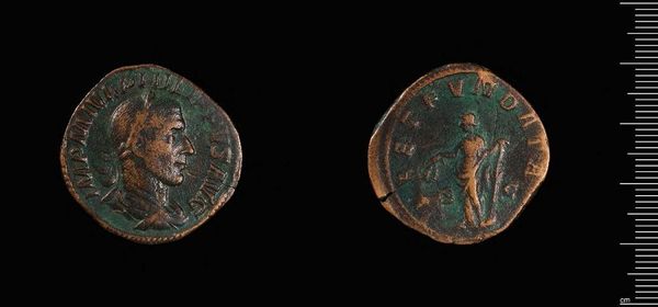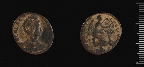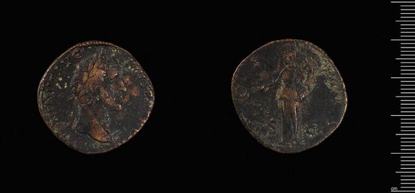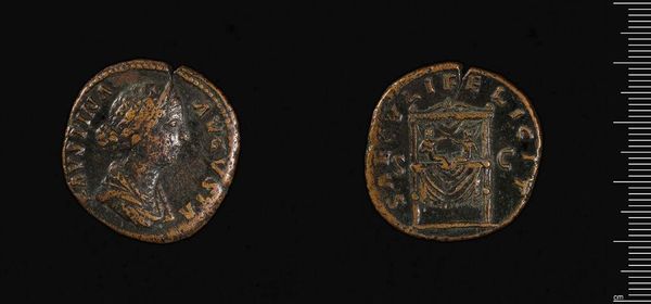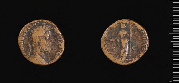Editor: Here we have a Sestertius, honoring Faustina I. It's a coin, so small, but weighty. I notice the portrait of Faustina on one side, and a complex image on the other. How should we interpret this piece within the context of its time? Curator: This coin offers a glimpse into the construction of female power and memory in ancient Rome. Consider how Faustina, as empress, was presented and remembered. Coins like these circulated widely, shaping public perception. What does it tell us about the role of women in the imperial project? Editor: So, it's not just money, but also propaganda? Curator: Exactly. These images reinforced imperial authority and idealized feminine virtues. We must also ask, whose voices are missing? Whose perspectives are not represented on this coin? Editor: It’s amazing how such a small object holds so much historical weight. I’ll never look at coins the same way again.
