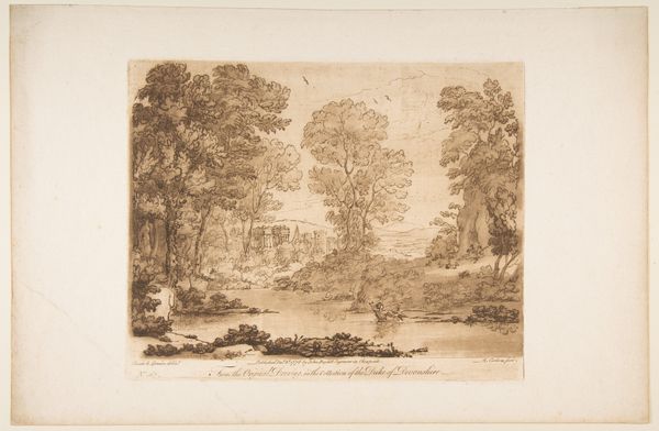 Curator: Let’s explore Schloss Pouch, an intriguing landscape etching by Johann Philipp Wilhelm Lenz. Editor: There’s something melancholic about it, a sort of wistful charm. The limited tonal range almost mutes the scene. Curator: Notice how the artist arranges the pastoral foreground, the reclining figures and sheep, as a repoussoir to draw the eye toward the castle in the distance. The architecture provides a fascinating counterpoint. Editor: I'm more intrigued by the labor embedded in the scene, the shepherd’s quiet dominion over the flock. One also wonders about the process to create the etching, all those painstaking lines. Curator: Indeed, the formal tension between the ordered castle and the natural chaos is quite compelling. Editor: It certainly gives you food for thought about the people and tools that made this picture, and the lives they led.
