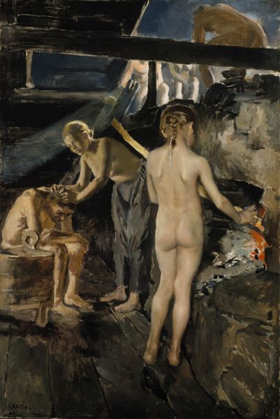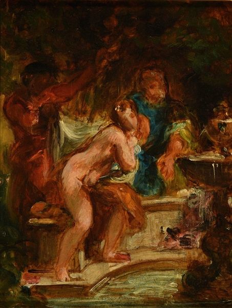 Editor: Here we have Hans von Marées' "Nude Women in a Landscape." No date is listed, but it strikes me as something from the late 19th century. The figures are so somber, almost classical in their repose. What do you make of this curious scene? Curator: Somber is right! It’s as if Marées is painting a memory fading at the edges. The nymphs seem lost in thought, or perhaps banished from a more vibrant world. Look how the light struggles to penetrate the heavy foliage. Do you feel a sense of longing? Editor: Absolutely. A longing for something just out of reach. The woman on the right almost looks as if she is looking back into the past. Curator: Exactly! Perhaps Marées is mourning a lost ideal, using the female nude not for titillation, but for reflection. It’s a wistful, almost melancholic, vision of beauty, isn't it? Editor: It is, and a different take than I would have expected on this subject matter. Thanks for sharing your perspective. Curator: My pleasure. I am glad we could share this experience together.