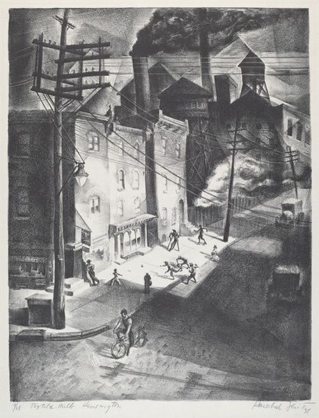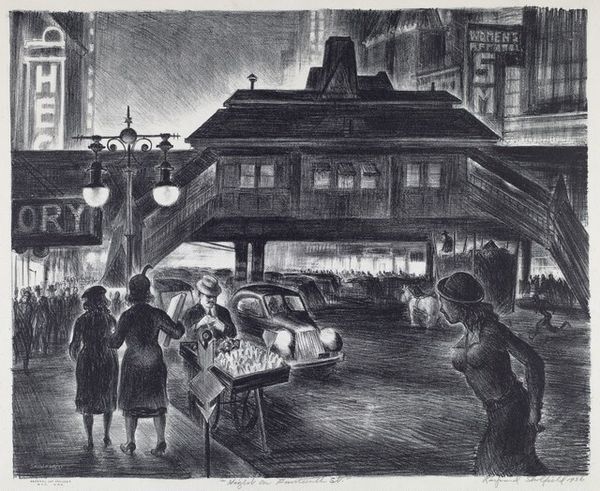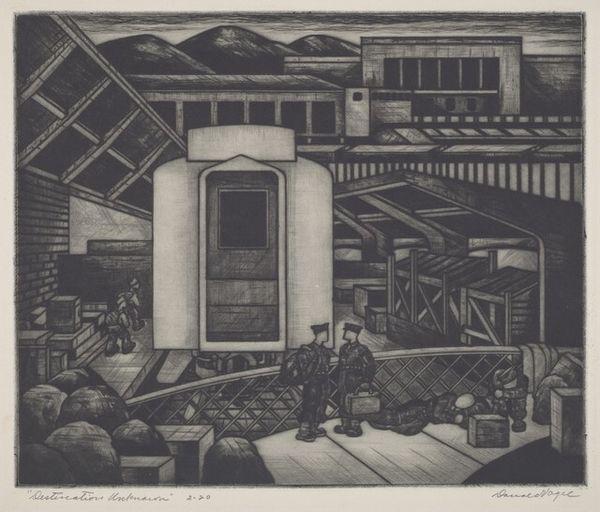 Millard Sheets created this lithograph titled 'Family Flats.' The composition presents a stark contrast between the geometric architecture and the organic forms of the figures. This juxtaposition sets up a visual tension, drawing us into a complex interplay of line, shadow, and texture. The strong diagonal lines of the staircases and clotheslines create dynamic movement, yet they also confine and intersect the spaces occupied by the figures. The artist uses light and shadow to define the architectural space and the figures within it, adding depth and suggesting the weight of their environment. The image is structured through a series of repetitive horizontal and vertical lines, which echo the architecture, while the figures create a softer, more human counterpoint. The lack of color emphasizes the tonal contrasts, enhancing the visual impact of the textures and patterns. This lithograph is not merely a representation; it is an exploration of how form and structure can convey the multifaceted experience of life within these spaces.