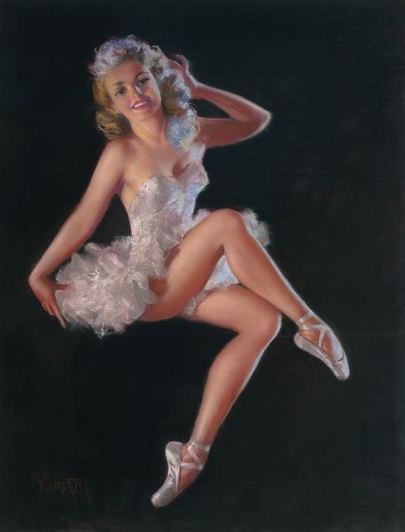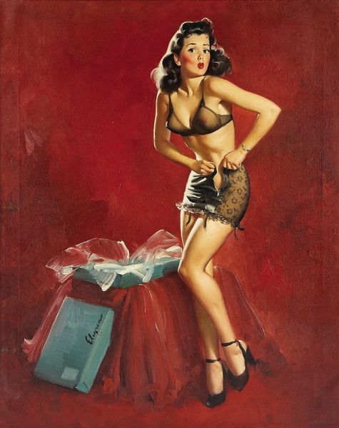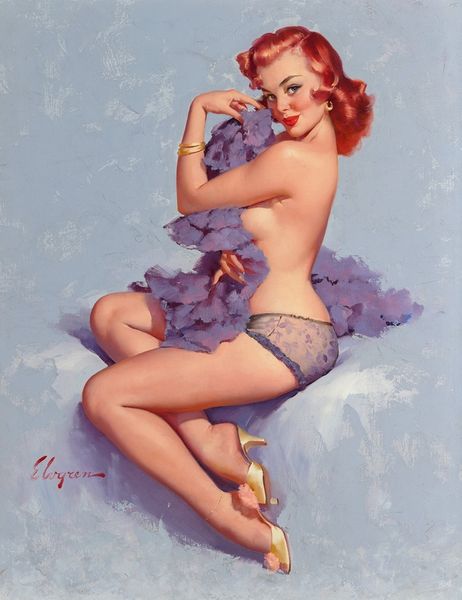 Gil Elvgren painted "This Is the Skin I Love to Touch" with what looks like a light touch and a clear intention: to show you something... or rather someone! I mean, look at that fur. Those dark, defined strokes mimic depth, almost as if you could reach out and feel the plushness. It's such a contrast to the woman's skin, which has this soft, almost airbrushed quality. The color palette is warm, inviting. It makes you think about vintage ads and the way they sold dreams. But here's the thing, it isn't about what you see. It's about how you see it. Elvgren uses classic painting techniques, but the subject matter pushes it into a different zone. Is it high art? Low art? Maybe it's both, or maybe it doesn't matter. Think about someone like Lisa Yuskavage, who also plays with this kind of idealized form. Ultimately, it's up to you to decide what it all means.