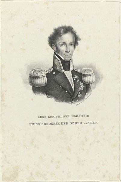Editor: This is "Portret van Frederik, prins der Nederlanden," a print from sometime between 1827 and 1871, currently at the Rijksmuseum. He looks so formal in his military attire. I'm struck by the way the light emphasizes his face and those elaborate shoulder decorations. What can you tell me about its context? Curator: This print exemplifies how power was visualized and disseminated in the 19th century. Its creation and distribution are deeply intertwined with the rise of nationalism and the construction of a unified Dutch identity following the Napoleonic era. Editor: So, this wasn’t just about showing what the Prince looked like. Curator: Exactly. Think about it – this print would have been reproduced and circulated widely. How might that have served the ruling family, particularly in an era grappling with ideas of nationhood and popular sovereignty? Editor: It's a carefully crafted image designed to project authority and legitimacy. The symbols, the uniform… they all contribute to this image of a strong, stable leader. Was romanticism, which the artwork metadata mentioned, always associated with leaders? Curator: Romanticism wasn't always inherently tied to leadership, but it could be instrumentalized to construct powerful national narratives and associate leaders with particular values – think of the picturesque landscape behind him. Doesn't that invoke a sense of connection to the land, to the Dutch nation? Editor: It does. I guess I hadn’t really considered how prints like these operated as a kind of… propaganda, almost. Curator: In a way, yes. It reveals how images become active agents in shaping public opinion and solidifying social hierarchies. It’s a good reminder that what we see in a museum is often the result of complex political and social forces. Editor: This has made me rethink the role of portraiture in general. It's not just about capturing a likeness, but about actively constructing an image, a message. Curator: Precisely. By understanding the historical context and the social functions of images like this, we can gain a much deeper understanding of the past and its relationship to our present.