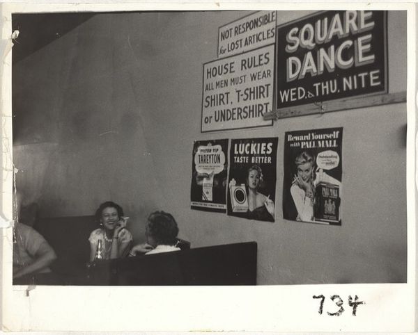 Curator: Here we have Robert Frank’s gelatin silver print, "Man before liquor store--Las Vegas," created in 1955. It’s a piece that really speaks to the undercurrents of American life in the mid-20th century. Editor: Woah, this hits me right in the gut. It’s…lonely, right? The fella's got this world-weary stare, kind of hidden by that hat, framed by all these desperate-looking advertisements. Curator: Frank’s work is often categorized as social realism. Notice how the composition implicates this man within a wider context of consumer culture and economic disparity. He isn’t just a face; he’s a symptom. Editor: Exactly! All the signage just amps up the mood. "Mike's Liquor Store, open 24 Hours"... Magic! But is it, really? The man is placed against promises of escape and release, making you wonder whether they truly offer those. I can imagine all the promises of American bliss ringing hollow against reality. Curator: Precisely. Frank, a Swiss immigrant, had a unique perspective on the American Dream. He captured the less-glamorous aspects that were often ignored or romanticized. You know, this photo appears in "The Americans", a controversial yet highly influential collection that critiqued the prevalent optimism. Editor: He saw beyond the Kodak smiles. It’s kind of ironic that a country is sold on such idealized dreams—through ads like that smiling couple and the cigarette, selling you "good taste"—while there's probably just an unacknowledged crisis brewing right beneath the surface, reflected on the poor guy, standing there, with this bleak sense of endurance, in this print. Curator: And this brings us to the importance of documentary photography as a critical tool, shedding light on marginalized communities and prompting dialogue about social structures. Frank’s approach, although not without its critics, played a significant role in shaping how we view photographic representation. Editor: Totally. I feel like this single image, rough edges and all, kind of rips apart that whole “shop 'til you drop” illusion. It makes you wanna peek behind the curtain. Curator: Looking at this image, it pushes us to reconsider our relationships with commodities and how marketing reflects the realities we are living in or desire to obtain. Editor: Absolutely, this image whispers untold stories and really gives a moment of sobering reality to the illusion and what we perceive to be truth.