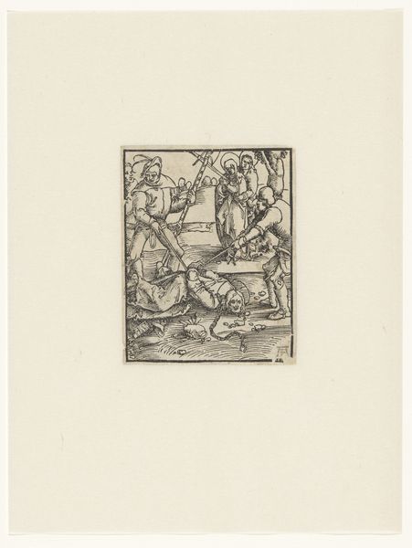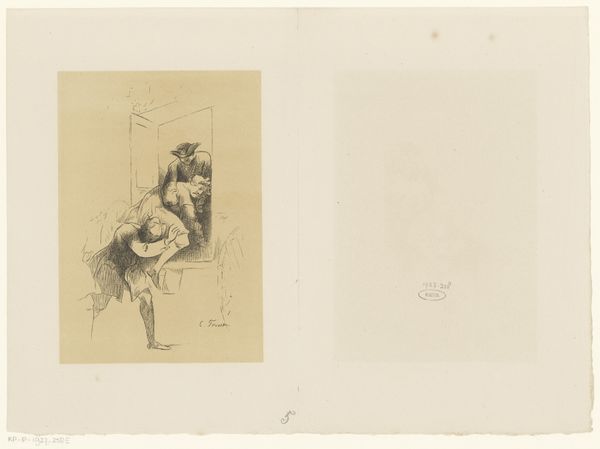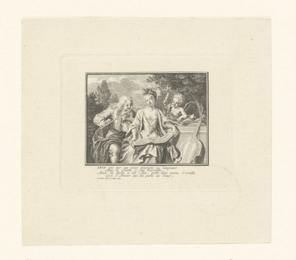Editor: Here we have "Boerenfamilie," or "Peasant Family," an etching by Andreas Scheits, created sometime between 1665 and 1735. There's a quiet intimacy to it, despite the rustic subject. The composition feels a bit... unbalanced, maybe? What do you see in this piece? Curator: Unbalanced is a fascinating word to use. It resonates. For me, this piece whispers of resilience, that quiet hum beneath the surface of everyday life. Scheits captures, with deceptively simple lines, a world where hardship and tenderness intertwine. Do you notice how the mother, with her heavy load, seems to stand apart, almost as if caught between two worlds? Editor: I do now that you point it out. She's separated, but still very much a part of the scene. What about the father figure? Curator: He anchors the scene. Look at the way he cradles the child; there is an inherent grace in his gesture, isn’t there? And yet, observe his weathered face, those deeply etched lines speaking volumes. Consider what the artist might be suggesting by placing the two adults slightly apart: one entering the home and domestic scene, while the other sits safely near to its dwelling. Are they reflections of societal expectations, a gentle commentary on gender roles in the 17th century? Editor: It could be. I hadn't thought about that dynamic at all! I was too busy looking at the figures individually. Curator: That's the beauty of art, isn’t it? We bring our own experiences and perspectives to the table, and each encounter offers a new interpretation. It's not about finding the "right" answer, but about engaging in a dialogue with the artwork, with the artist, and, ultimately, with ourselves. I find my understanding deepened with your interpretation as well! Editor: Absolutely. Seeing the interplay of figures changes everything!