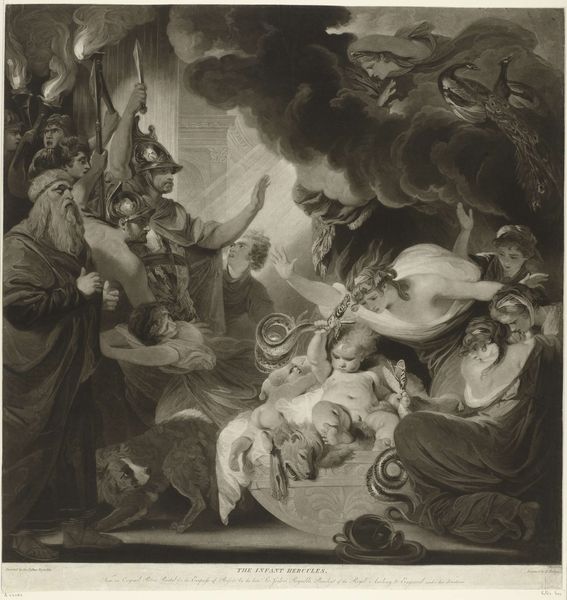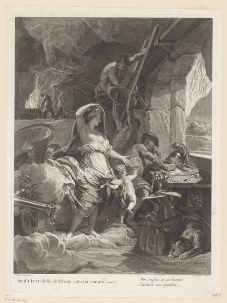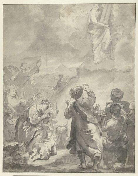 Editor: This is "The Ecstasy of Saint Paul," an engraving by Jeremias Falck from around 1655. The light and shadow are so dramatic. I am curious to understand the relationship between the earthbound and heavenly realms within the composition. What do you see in this piece from a formalist perspective? Curator: I observe first the clear visual division articulated by the engraver, separating the composition into distinct zones. Note the earthly domain occupied by Saint Paul and the ethereal realm populated by angelic figures. Consider how Falck has orchestrated line and tone to create a palpable contrast between the corporeal weight of Saint Paul and the weightless quality of the divine entities. The sharp lines in Saint Paul’s form accentuate his physical presence while looser hatching suggests cloud-like forms above. Do you see how that works to define his rapture? Editor: I do! The contrasting engraving styles make it really clear. The bottom portion feels weighty while the top feels like, well, clouds. Curator: Precisely. Furthermore, the composition employs a distinct upward movement, guiding the eye from the seated figure towards the celestial vision. Notice the orthogonals created by Saint Paul's implied gaze, further reinforcing this ascending direction and visually mirroring the content. Are you observing how the formal relationships generate symbolic significance here? Editor: Yes, I think I am. That makes the sharp lines seem even more meaningful. It is amazing how all these lines come together to create that upward sense. Thank you, this helped a lot! Curator: You're welcome. Reflecting on Falck's arrangement, the engraving successfully constructs both an image and a deeper understanding of ecstasy, capturing the complex tension between earthly constraint and divine inspiration through solely formal relationships.