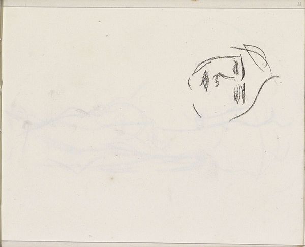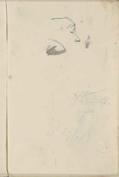 Curator: Here we have George Hendrik Breitner’s pencil drawing, "Studie," from 1917, currently held in the Rijksmuseum. Editor: The immediate impression is fragility, almost as if it might fade away if we look at it too intently. The pencil strokes are so minimal, just enough to hint at form. Curator: Breitner was deeply interested in capturing the ephemeral – fleeting moments of everyday life, particularly in Amsterdam. His paintings often have a snapshot quality. This drawing, a study as the title suggests, echoes that pursuit. Editor: You see this as capturing a fleeting moment? To me it looks more like examining how we, as thinking beings, are made visible through material practices such as using pencil and paper. What we designate as 'art' obscures the artist's physical involvement in a network of things like graphite production or paper manufacture. Curator: Interesting perspective. But what intrigues me are the choices made by the artist within these constraints. Notice how a few strategically placed lines suggest depth and shadow, conveying so much with so little. Does focusing too much on raw material eclipse Breitner's vision, almost? Editor: Not necessarily. The social and industrial forces allowing Breitner to simply pick up that pencil are part of how we imbue objects, or drawings of them, with value and give the illusion that they reflect truth or hold emotional relevance for us. The minimal intervention of the pencil reflects just that; a human-derived production and projection. Curator: So, you see the scarcity of marks not as intentional artistic expression but as a symptom of production? I like that it pushes me to consider my romantic conceptions around artistry. Editor: Exactly! Maybe by focusing on the subtle signs left behind from a worker who applied force with graphite, on a pressed, pulped material – we understand why museums keep art so safely behind ropes. Curator: I find it interesting how focusing on either aspect changes what I perceive. Perhaps they meet somewhere in the middle – the individual grappling with societal forces through this 'simple' drawing? Editor: A thought indeed worth pondering as we step away and explore the collection.