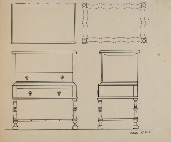Curator: What immediately strikes me about this work is its rather unassuming elegance. It feels very still and reserved. Editor: Agreed. We’re looking at a pencil drawing by Bernard Gussow, created sometime between 1935 and 1942, titled "Desk." Curator: Desk as in, the place for labor, for writing? The rigidity and geometric style almost seems to resist the more fluid associations with the activity of writing. I find myself thinking about power structures inherent in those who possess such desks, especially in this historical period. Editor: It’s an interesting point. Consider the historical context – the late 1930s and early 40s. The linearity and precision can also reflect the increasing rationalization of labor happening in this era. We have two views presented, one of the desk straight-on, and another in profile. Curator: The multiple cubbyholes, each potentially holding some crucial document or personal artifact, feels almost like an architectural rendering of memory and record-keeping. How were desks like these seen as status objects at the time? Editor: Certainly as emblems of authority, industry, and the efficient management of information. The materials involved – presumably valuable woods – signified economic standing. One also wonders about who had access, especially women during this period? What forms of knowledge production were limited to these spaces? Curator: It's like a miniature bureaucracy captured in lines. Perhaps that central locked door within the upper section further restricts who has ultimate control, who dictates what should and shouldn't be made public. This drawing of a desk raises critical questions about space, access, and the gendered politics of intellectual and administrative labor. Editor: Indeed, viewing this "Desk," we see more than mere furniture; we uncover stories of influence, and societal frameworks woven within the grain. I agree with you, that while simple on the surface, the Gussow drawing speaks volumes about the politics and social dynamics ingrained within art itself. Curator: So, the next time we see an object like this, perhaps we will also reflect upon who wields such desks, the labor happening at such places and also consider those often kept outside such enclosures. Editor: I appreciate your perspective. Thanks.