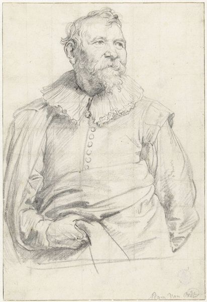 This is a 17th-century etching by Jan Lievens, titled "Bust of an Old Man in a Fur Coat". The composition is immediately striking for its concentration on texture and form. Look closely at the density of lines that articulate the fur, contrasting with the smoother areas defining the face. Lievens masterfully uses hatching and cross-hatching to create depth and volume, especially noticeable in the fur coat's voluminous presence. The formal arrangement draws attention to the semiotic relationship between age and material status. The fur coat not only denotes warmth but also implies a certain level of affluence or social standing, which is juxtaposed against the man's weathered face. The etching's monochrome palette further strips away distraction, focusing us on the interplay of light and shadow, revealing the formal structure of the work. Notice how Lievens uses the formal qualities of etching to explore themes of aging, identity, and representation within the cultural codes of his time. This print invites us to consider how these elements work together to construct meaning beyond mere representation.