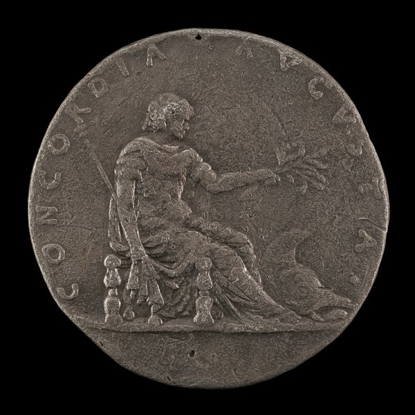 Curator: This is "Juno Sealing Marriage Pact with Jupiter [reverse]," a metal relief created around 1680 by Arvid Karlsteen. The medal presents a Baroque allegorical scene. Editor: My first impression is one of stark formality. The metal lends it a cool, almost clinical feel, yet the figures themselves possess a fluid, draped elegance. A cosmic handshake deal brokered with exquisite chill. Curator: Exactly. Consider the socio-political context: medals like this weren't just art; they were instruments of power, circulating specific narratives about dynastic legitimacy, about treaties. Note the inscription along the rim: "HINC REGNI HERES," or "From Here, Heirs to the Kingdom." Editor: Which underscores the staged nature of it all, doesn't it? A public contract, sculpted in rigid permanence, while Olympus may well have been brewing a storm of marital discord behind closed doors! Curator: The materiality is key here. Karlsteen chose metal, a durable, reproducible material. The relief allows for multiplication, enabling widespread dissemination of the intended message: a declaration of union. And who would be consuming such medals at the time? Whose allegiance was being sought? Editor: It almost makes me think about it like it is less like an artwork and more like a propagandistic tool! Curator: That would not be very far from the truth at all. But you bring an interesting lens through the concept of 'tool', but it doesn't only apply on the conceptual front! From the metallurgical practices involved in its manufacture to the very distribution of the work itself, Karlsteen’s piece, like many works in precious metals, serves as testament to human technical prowess at play through materials. Editor: In that respect it really does have beauty to it. Looking at it in such clinical terms and applying your perspective really gives insight on the kind of political circumstances that may have lead to such artistic endeavors. Curator: Indeed. The art of that era served more than just the pure purpose of beautiful form or design and really does reflect society back at itself as a cultural looking glass.