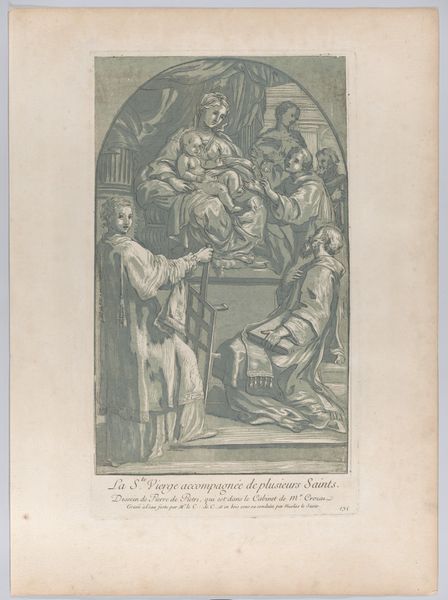 Curator: Let’s delve into this fascinating engraving: "Battle of Satan with St. Francis for the Soul of the Monk Guido of Montefeltro." Though undated, it’s attributed to Joseph Anton Koch. The scene presents a dramatic spiritual conflict rendered in meticulous detail. Editor: My immediate impression is of contrasting planes—chaotic, earthy struggles versus serene, celestial order. There’s a real sense of opposing forces clashing. It’s almost theatrical. Curator: Absolutely. Consider how this portrayal draws on the historical power dynamics within the church, reflecting the ever-present battle between good and evil. Guido’s soul becomes a symbolic battlefield where salvation hinges on intercession, specifically, in this case, St. Francis advocating on his behalf. Editor: From a formal viewpoint, notice Koch's effective use of light and shadow. The darkness of the battling Satan figure and Guido's earthly form starkly contrasts the luminous depiction of St. Francis and the angels above, doesn't it? This illuminates Koch's composition in an utterly convincing way. Curator: Indeed. That visual polarity underscores the narrative itself: it is a theological argument. Koch uses familiar iconographic representations. What strikes me is the positioning of Guido at the bottom, seemingly immobilized while external forces grapple for control. One wonders what social narratives the engraving touches upon, particularly concerning agency and spiritual redemption at the end of life. Editor: Note the careful orchestration of figures to build tension and drama. Look how the directional lines of sight pull the viewer upward towards the saint while also being grounded by the figures. The entire piece is contained beautifully inside its rectangle form, a formal solution to narrative representation! Curator: Seeing this image in the context of Reformation-era debates—debates concerning the authority of saints—frames the artistic purpose within a highly charged socio-political setting. This is what grounds Koch's theological project and gives it real historical relevance. Editor: It really is interesting to observe how these artistic and socio-historical frameworks give form and weight to this struggle. Curator: Considering all these details together certainly brings new meanings to Koch's composition and theological implications for his intended audience. Editor: It’s always enlightening to dissect how various frameworks, sociohistorical and artistic, inform and challenge one another, revealing further dimensions of visual works such as this engraving by Koch.