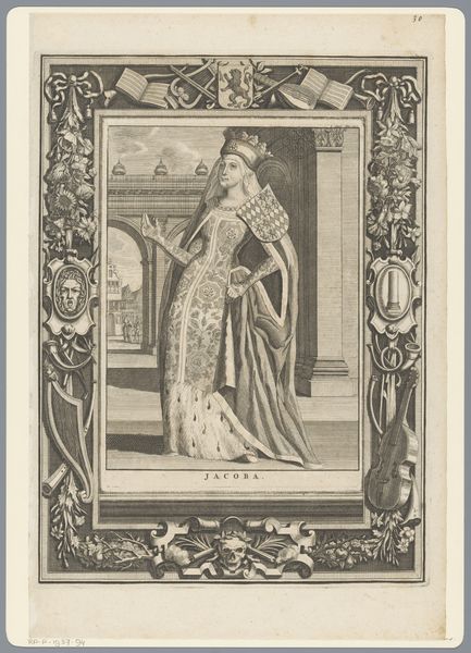 This is a small engraving of Mary, Queen of Scots, made by Marten Baes sometime between 1604 and 1652. Executed with fine lines, the oval composition contains a portrait of Mary framed by heraldic symbols. The intricate details of her dress and the surrounding emblems create a densely patterned surface. Note how the sharp lines of the engraving define the textures and shapes, from the delicate lace collar to the heavy folds of her gown. The composition is rigidly symmetrical, a structured arrangement that reflects the formal conventions of royal portraiture. Mary holds a book in one hand and a crucifix in the other, signaling faith and intellect. The presence of an ax and the stone block on which they rest, usually used for executions, destabilize the reading of regal power. Baes uses the formal language of portraiture to explore themes of sovereignty, martyrdom, and the complex interplay between image and power.