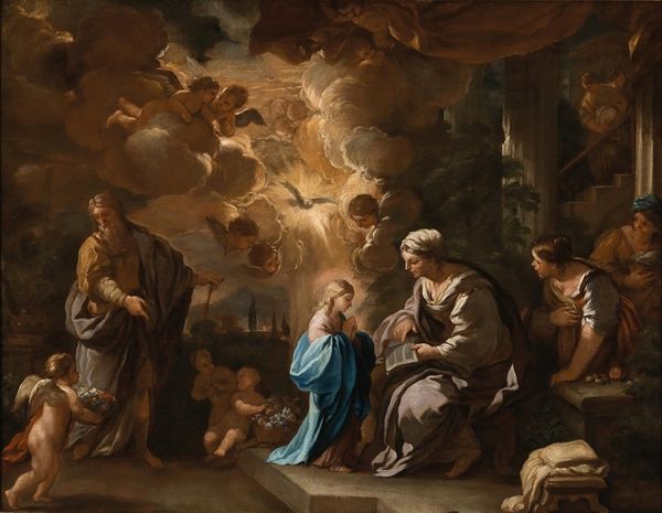 Editor: Here we have Sebastiano Conca's "The Adoration of the Shepherds" from around 1720, an oil painting currently housed at the Getty. It strikes me as quite theatrical with the lighting and the array of characters gathered around the newborn. What stands out to you in this piece? Curator: Immediately, I'm drawn to the materiality of the painting itself. Consider the price of pigments at this time, and how the vibrant blues and reds signaled wealth and patronage. What sort of commission led Conca to select oil on canvas, a process allowing for layers and adjustments, rather than, say, fresco? Who was dictating the content? The cost of ultramarine was more expensive than gold, what was the function of it, to show off wealth? Editor: That’s a compelling perspective. It makes me wonder about the social context in which it was created. You mentioned the commission, who was Conca working for at this time? Curator: Examining the composition – the division between the heavenly angels and earthly shepherds – it seems a reflection of the rigid social hierarchies of the time. Also consider the availability of these materials. Was Conca experimenting with novel pigments? Where were these materials sourced? The method is part of the meaning. It tells us of commerce and exchange in that time. Editor: The origin of the pigments does speak to broader trade networks. I never thought about art that way. Curator: The labor involved is often overlooked, too. How many hours of grinding pigments, stretching the canvas, and layering glazes are hidden within this seemingly effortless scene? Do we devalue craft by omitting the labor necessary to create something? Editor: I’m definitely thinking differently now about what this painting represents. It is fascinating to realize how many stories a piece of art can tell when you consider the materials and process! Curator: Indeed, understanding the "how" often reveals a deeper "why" than purely aesthetic interpretations allow.