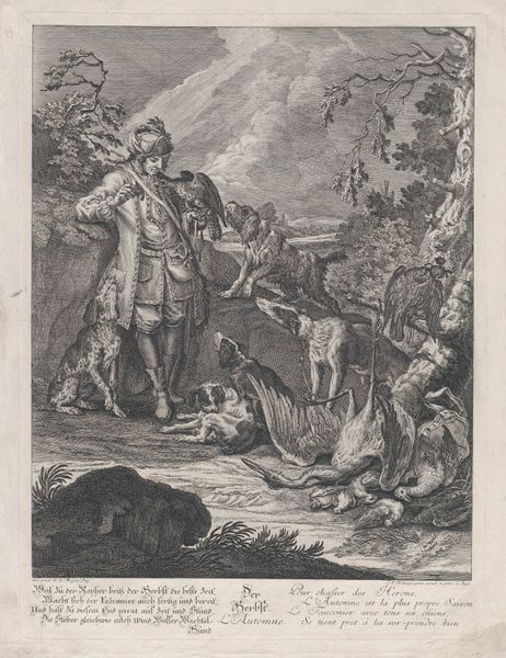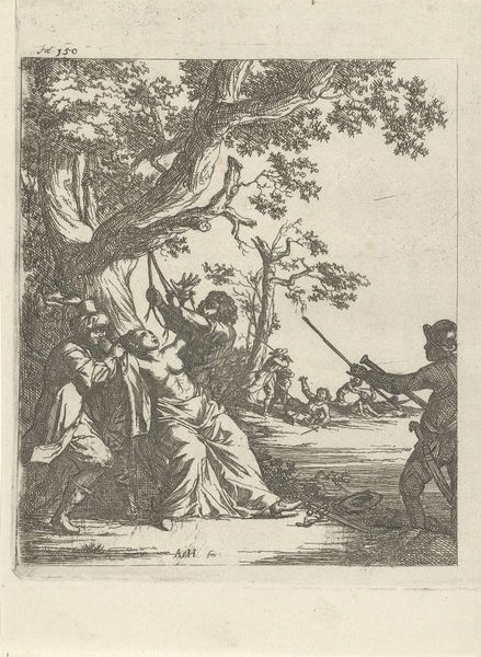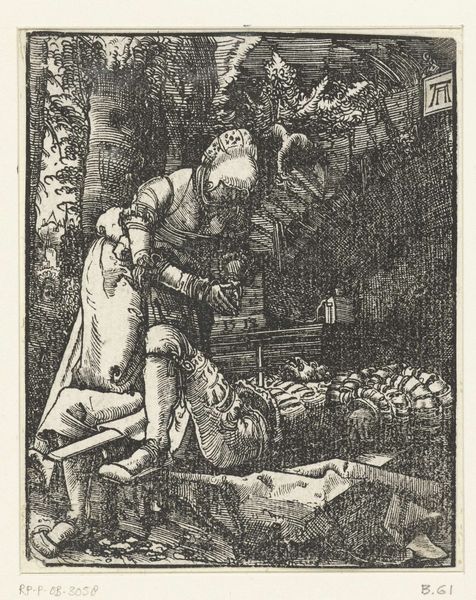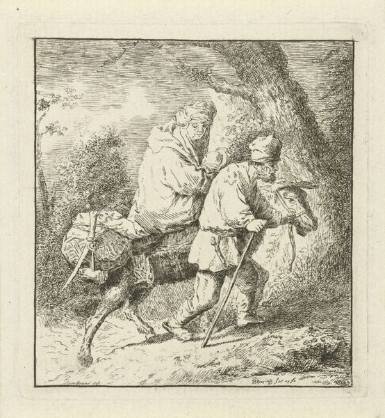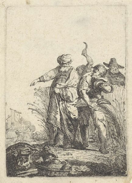 Editor: So, we're looking at "Man and Woman Gathering Wood," an etching or engraving by an anonymous artist from the Dutch Golden Age. I'm struck by how…ordinary it is? I mean that in a good way! How do we even begin to interpret something so seemingly simple? Curator: Ordinary is a great observation! Let’s focus on the labor presented here. The material conditions depicted in this image of gathering firewood speak volumes about 17th-century Dutch life. Consider the process – the physical act of collecting wood, the tools or lack thereof, the clothes they are wearing – and the possible reasons they're gathering wood: fuel, warmth, survival perhaps. Does seeing these depicted so plainly challenge traditional "high art" themes for you? Editor: Absolutely. I’m used to thinking about landscapes in terms of picturesque beauty, not...resource acquisition. The rough lines of the etching feel almost…industrial, documenting the scene more than romanticizing it. Are we meant to think about this labour differently because it’s an engraving? Curator: Precisely! The choice of engraving as the medium—a replicable, accessible format—further democratizes the image, diverging from unique, highly-valued paintings. This wasn't destined for a palace; it was for broader circulation. Notice the social context hinted at in the distance – windmills perhaps? Editor: That’s true! It almost puts the manual labour here against the backdrop of developing technology and its possible effect in everyday life. I guess this pushes me to reconsider art's relationship to social and economic realities more. Curator: And that is precisely the value in examining the materiality and process, isn't it?