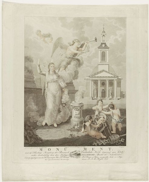 Editor: Here we have "Monument for the Third Centenary of the Reformation, 1517-1817," an engraving from 1817 currently held at the Rijksmuseum, attributed to Walraad Nieuwhoff. It's quite dense with symbolism, almost like a stage set. What's your take on it? Curator: Well, consider the context. This print commemorates the 300th anniversary of the Reformation. The figures aren't just decorative; they represent powerful socio-political and religious forces at play in the early 19th century. Who do you think the central female figure embodies? Editor: My first guess would be maybe an allegorical figure representing the Reformation itself? She seems to hold a book, perhaps the Bible? Curator: Precisely. The book signifies the importance of scripture in the Protestant movement. Notice how she stands triumphant over the figures below, suggesting the triumph of Protestantism over its opposition. The snake is definitely an interesting addition here! It creates quite an impact on the composition, wouldn’t you say? Editor: Yes, definitely! Now that you mention it, it's hard to ignore that snake being crushed at her feet. And what about the bust? Is that Martin Luther? Curator: Good eye! Indeed it is Luther, presented as a respected leader. What's interesting is how the monument itself is being presented, in the midst of idealized, almost fantastical imagery. It elevates the historical event to the level of myth. This points to the role imagery played in shaping public perception. It served not just to record but to construct a specific narrative. Editor: So it's less about historical accuracy and more about projecting a particular idea of the Reformation's legacy? Curator: Exactly. And that's where understanding the historical and socio-political background becomes crucial. Art, like this print, participates actively in the shaping of collective memory and the affirmation of societal values. Editor: That's really fascinating. I had been thinking about it only formally, but it’s incredible how much the context changes my understanding of the whole thing. Curator: Absolutely, and understanding art is as much understanding social history.