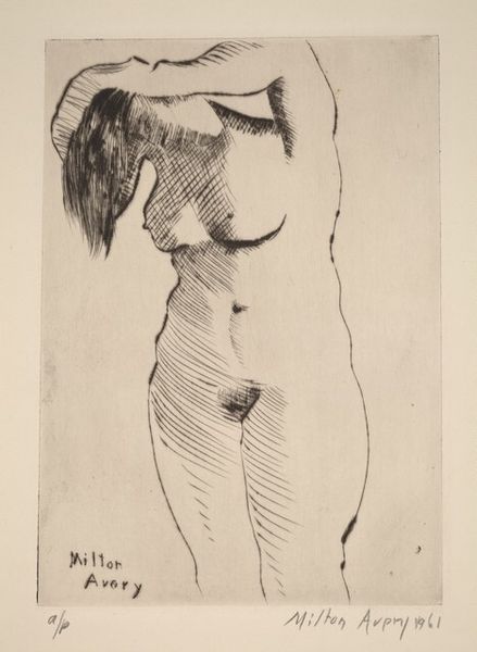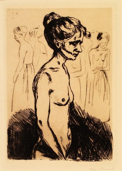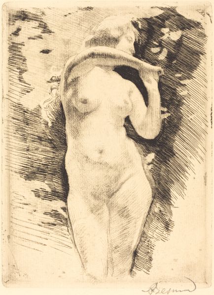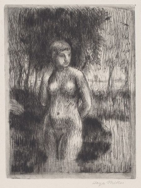 Curator: Before us we have Childe Hassam’s 1918 piece titled, simply, "Nude". This graphite and charcoal drawing offers a somewhat different facet of an artist primarily celebrated for his contributions to American Impressionist painting. Editor: It has such an intensely graphic feel—a dynamic push-and-pull with harsh marks that really convey tension and something a bit hidden. It's interesting that a relatively simple composition can suggest all of that. Curator: Indeed, notice how the diagonal strokes create an almost frenetic energy, barely allowing a restful space for the eye. Hassam deliberately utilizes line quality, varying pressure to create dark accents which play against the untouched paper—it's an investigation of the visual mechanics themselves. Editor: The woman almost disappears into this field of jagged, black marks—as if consumed or camouflaged, right? She could be a woodland nymph of sorts…an alluring feminine ideal trapped or disguised by societal pressures. Curator: It could also point towards the changing stylistic preferences toward stark realism in art, an embrace of psychological states which can manifest in the visible world, even overwhelming and deconstructing it. Editor: Considering its execution around the First World War, it's impossible not to sense some turbulence represented, maybe even female grief within it, reflected through history and the present at once. A visual representation of a complicated, fragmented world. Curator: I'm drawn back to the pure technicality; the formal choices of composition creating such a strong atmosphere. And yet I cannot help but see echoes of Symbolism’s pre-war concerns. It feels poised right between styles, an interesting study in transition. Editor: Exactly, Hassam shows us that behind form there are almost always shadows and narratives which speak beyond aesthetic preferences. This piece whispers volumes even in its apparent stylistic reticence.