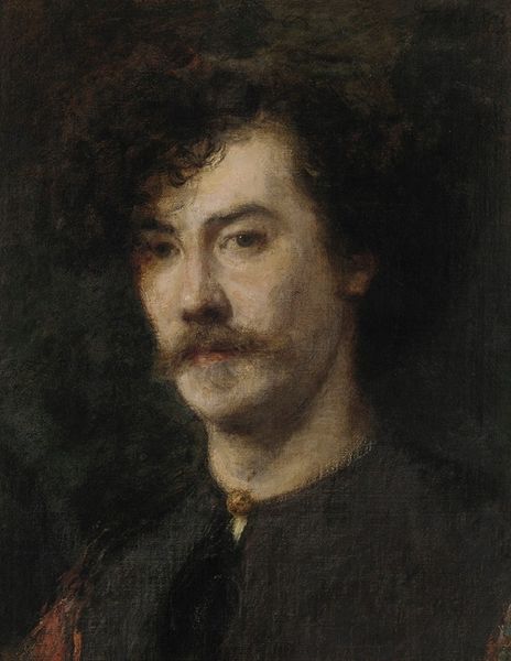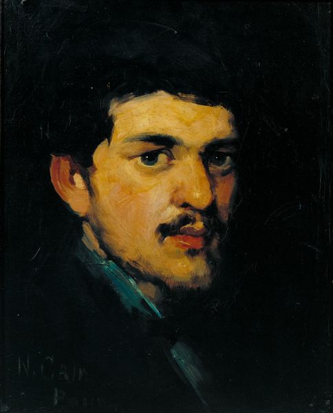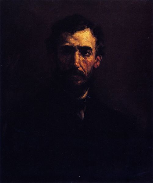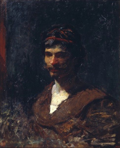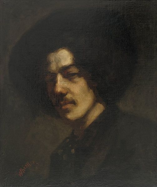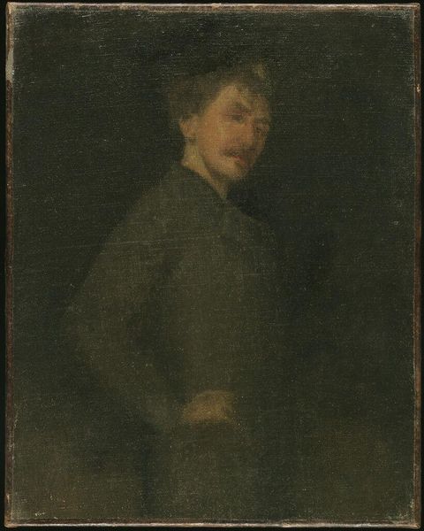 Curator: Here we have James Abbott McNeill Whistler's "Gold and Brown (Self Portrait)," an oil painting completed in 1896. It's striking how the somber tones are interrupted by the flash of pink on the cheeks. What's your initial take? Editor: I get the sense of someone retreating. It's almost swallowed up by darkness. Very introspective. Does the colour symbolise health, vigour, or perhaps a defiance against encroaching shadows? Curator: Possibly! Whistler was always intensely concerned with the aesthetic impact of colour. Note the limited palette: browns and golds contrasted by the blush and the faint red accent, which echoes throughout Whistler’s tonalist aesthetic. The carefully muted colour creates harmony, aligning the picture’s subject with a delicate emotional mood, but, can we assume something deeper? Editor: Perhaps he wanted to immortalize his features as he aged? And the use of colour could mean that, regardless of encroaching darkness, humanity will persist. Do you think he actually saw himself this way or is he idealising here? The almost exaggerated, yet muted rouge suggests some amount of careful deliberation. Curator: Knowing Whistler’s notorious vanity, I wouldn’t discount a degree of idealization. He certainly presents himself with an air of artistic authority, or perhaps defiance. The brushwork is loose, especially in the background, hinting at the influence of Impressionism and challenging Academic norms. He does hint at Impressionism without outright agreeing with it. A slight but conscious decision! Editor: Definitely! Look at that almost aggressively bold and expressive dash of pigment over the right cheek! Even for Impressionism that’s loose and bold! You feel like he is in the depths of consideration here, perhaps the work of an artist trying to find new modes of self-representation towards the close of their own career? I do have a lot of sympathy here for him! It speaks across time! Curator: It does. What initially appears to be a study in shadow becomes a powerful statement on artistic identity. A quiet symphony of self-regard, memory, and even artistic progression. Editor: Yes, definitely a symphony played on the canvas with such deep personal reflection! Wonderful.