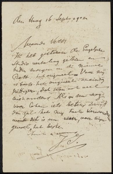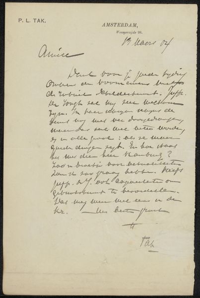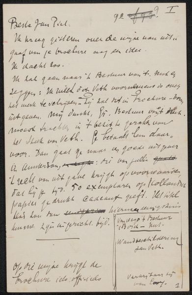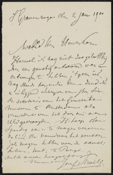 Editor: Here we have Jozef Israëls’ “Brief aan Pieter Haverkorn van Rijsewijk,” likely from 1896, made with pen and ink on paper. It's a handwritten letter, and there’s something quite personal about seeing the artist’s own handwriting. What stands out to you in this piece? Curator: Well, beyond the intimacy you observe, I'm drawn to consider what this letter communicates about the power dynamics inherent in artistic patronage at the time. The tone of the letter seems quite formal, yet vulnerable. Considering Israëls’ background, his Jewish heritage, and his focus on portraying working-class life, do you think his identity may have shaped his relationship with more privileged patrons like Haverkorn? Editor: That's a really interesting point. It hadn’t occurred to me to consider it through that lens. Could the very act of writing, this careful crafting of a message, be seen as a negotiation for respect or acknowledgment, given the social hierarchy? Curator: Exactly. The materiality of the letter itself—the paper, the ink, the careful script—speaks volumes. Each element contributes to the construction of an identity seeking validation. Israëls' success was tied to the acceptance and appreciation of collectors. Can we then view this letter as a subtle commentary on artistic dependency and the pressures faced by artists who operate outside the dominant social structures? Editor: I'm beginning to see how an ordinary letter reveals so much about the complex relationships between artists, patrons, and the social forces at play. I appreciate your insights. Curator: And I appreciate your willingness to delve into the socio-political narratives embedded within this seemingly simple letter. It highlights how deeply intertwined art and social relations are, particularly within a context of inequality.