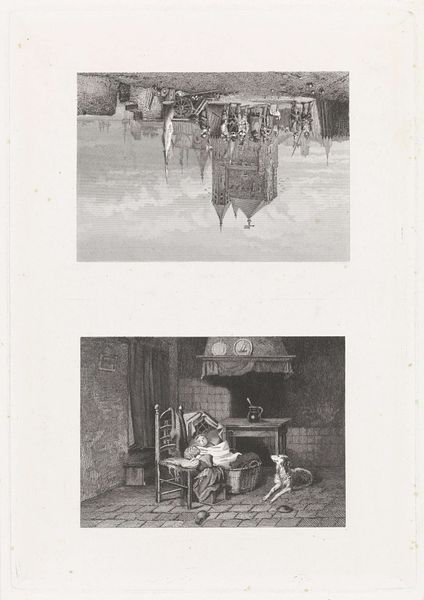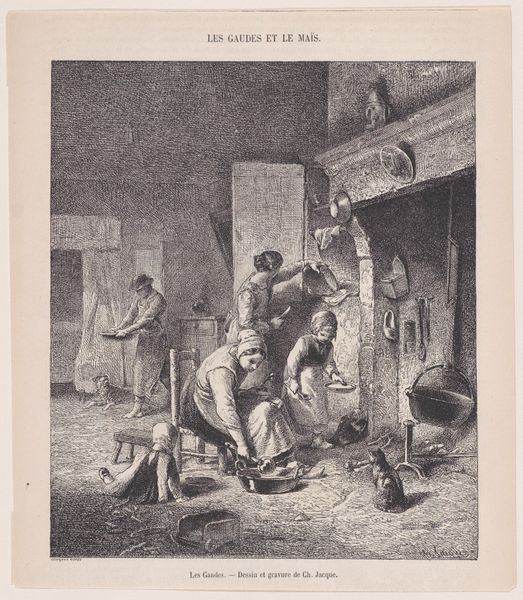 Curator: Immediately, I’m drawn to the sharp contrasts – a bright, busy interior contrasted with the dark wood and shadows near the doorway. It lends an air of furtiveness, wouldn’t you agree? Editor: Precisely! This piece, "The Eavesdropped Conversation," created in 1845 by Carel Frederik Curtenius Bentinck, presents such an engaging scene. We have three figures and an environment full of quiet drama rendered as a print. Curator: Printmaking – always fascinating. I consider it from the point of view of production, really. How were the marks made? It appears like steel engraving due to its density and precision... It creates wonderful textures to mimic the textiles in the woman's clothes. So what did the artist want us to feel through these labor intensive means of reproduction? Editor: I wonder how its meaning would be altered without those social conditions! One thing that is readily apparent is how domesticity becomes a stage for narrative. What unfolds within the confines of the home—relationships, work, family secrets—becomes quite political under such scrutiny. The eavesdropper peering through the shutters has an implication beyond idle curiosity, especially in how public images were consumed during this period. Curator: Ah yes, the man at the window… His access—literally and figuratively—seems crucial. And so is the material Bentinck presents, isn’t it? This space of cloth-making with tools in domestic production and its connection to home. He makes it all quite apparent. Editor: How intriguing to consider it that way! I am particularly moved by the compositional staging here, framing each aspect of the narrative—the woman paused in the doorway, the other at her work and the hidden watcher all carefully contained. It truly illustrates, in very quiet means, the 19th-century ideas around private and public roles, and how fraught they could be for many people. Curator: I concur completely. Looking at it from the lens of our current age, this attention to material, process, and domestic space opens channels through which the narratives and lives that these spaces hold are understood and discussed within culture today. Editor: I would never have expected the drama to stem from just this artwork's making; or perhaps the art's subtle nature comes from it instead.