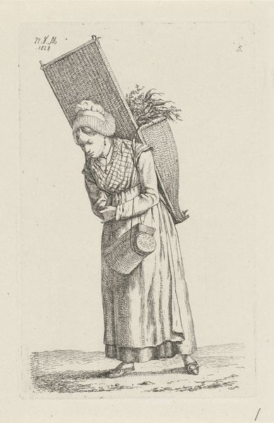 Editor: This pencil drawing, "Vrouw uit Luxemburg met een mand op de rug," created in 1828 by Anthonie Willem Hendrik Nolthenius de Man, immediately strikes me with its quiet depiction of everyday life. What's your interpretation of the woman's posture and the overall feel of this piece? Curator: Well, seen through a historical lens, this piece provides a fascinating insight into the public representation of labor and identity. Consider the Romanticism of the era, with its idealization of nature and 'folk' culture; do you think this drawing plays into or perhaps critiques that idealization? It is worth noting that prints like this were often used for distribution and documentation purposes. Editor: That's a great point about distribution. I hadn’t considered that. But she does look exhausted – burdened by her load, doesn’t she? Curator: Indeed. How does that impact our reading of it as either documentation or social commentary? During this period, images of working-class individuals were frequently circulated, performing the function of not merely picturing how the common person looked, but who they were in relation to broader social norms. The political work of imagery cannot be understated. Editor: So, it’s not just about what is depicted, but who gets to depict it and who gets to see it. Interesting. Curator: Precisely. And what message does that projection, whether intentional or otherwise, convey? Ultimately it is not just about artistic representation but a commentary on class and societal structures, made visible through art. Editor: This really puts a new perspective on the artwork for me, considering its place in the broader social framework. I was focusing so much on her pose, but completely neglected what this image says about her society. Curator: And that's how historical analysis can enrich our view of the artwork.