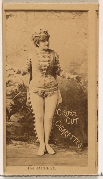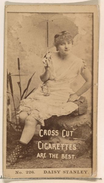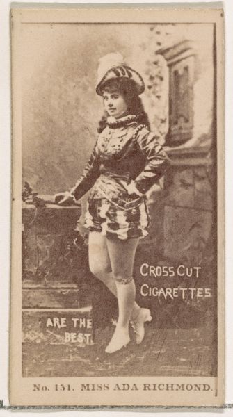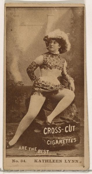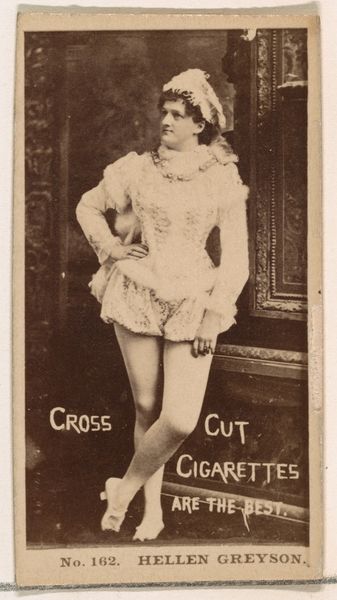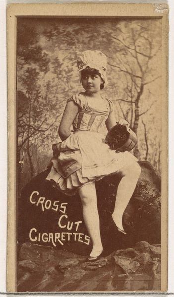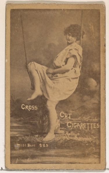 Curator: This is card number 113 from the "Actors and Actresses" series, created by W. Duke, Sons & Co. in the 1880s as promotional material for Cross Cut Cigarettes. Editor: It has a certain vintage charm, almost dreamlike in its sepia tones. Two figures on a sled—is that real snow or stagecraft, I wonder? It feels poised between genuine recreation and curated performance. Curator: Given that it's a cigarette card, intended to be collected, consider how accessible these images were. They acted as portable artworks, mass-produced through methods of printmaking and inserted directly into everyday consumer goods. The value was in circulation and distribution. Editor: That's precisely where I find the social commentary compelling. Smoking was highly gendered, but also coded by class. Who were these women in the photograph, how much control did they have over the construction of their image, and to whom did they represent an aspiration? These cards normalize leisure activity for a specific demographic, but whose labour produced these images? Curator: Labor practices in the late 19th century are obviously significant here, and the materials themselves are relevant—the card stock, the inks. The print was a means to popularize, to almost fetishize certain performances and personalities, effectively democratizing portraiture through capitalism. Editor: Indeed, this "democratization" wasn’t benevolent. Tobacco farming and cigarette production often relied on exploitation. The consumption of these cards coincided with larger societal issues: class division, the objectification of women, and the insidious rise of consumer culture driven by problematic labor practices. Curator: I agree. Thinking materially, one could examine the quality of the print run, variations in ink density, how the photographic image is reproduced for mass consumption. How many made it into albums versus ending up crumpled and discarded? What's their ultimate fate in landfills versus museums? Editor: It’s powerful to think of it now, situated in a museum collection—a marker of the shifting cultural norms surrounding recreation, identity, and commodification that still affect us today. Curator: Ultimately, its value lies not in any inherent artistic merit but its representation of cultural and manufacturing processes. It’s a snapshot of a moment embedded in material conditions. Editor: Leaving us to question what performative functions these seemingly harmless pieces of memorabilia continue to exert on gender and social memory.