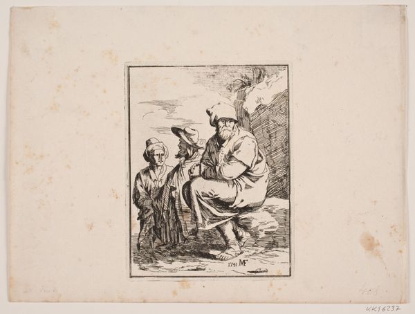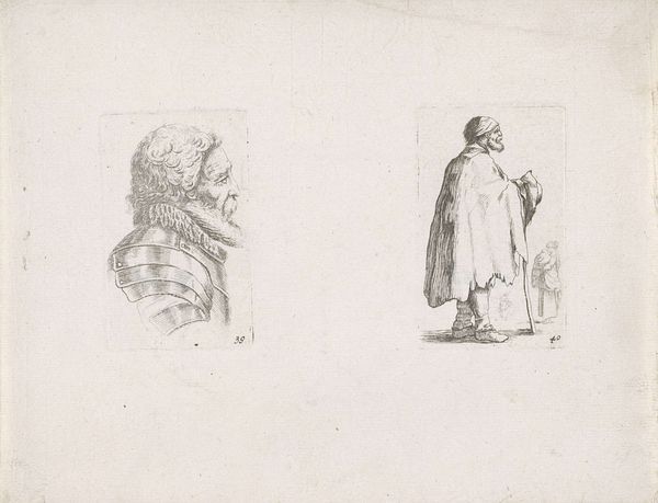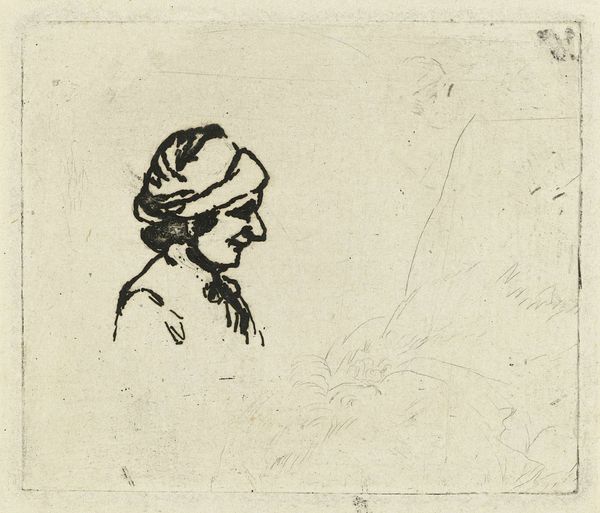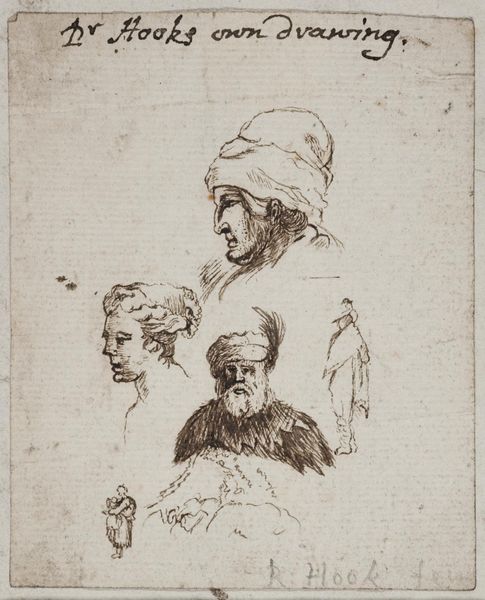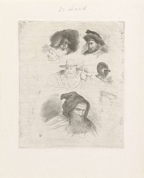 This is an undated etching with needle, drypoint and burin by an anonymous artist, entitled "Vier studies van hoofden en twee staande figuren", which translates to Four Studies of Heads and Two Standing Figures. Given the subjects, the work offers us a glimpse into the cultural imagination of its time, reflecting a fascination with different identities. Notice how some figures are adorned with turbans, suggesting an interest in or perhaps romanticized view of, the "Orient" and its people. We cannot know the artist's intentions, but works like this played a role in shaping perceptions and sometimes stereotypes of those from other cultures. It's an emotional experience to consider how such images can carry layers of historical context, influencing not only how people were seen then, but also how echoes of those views might still resonate today. The work reminds us to critically examine the stories we tell about each other and ourselves.