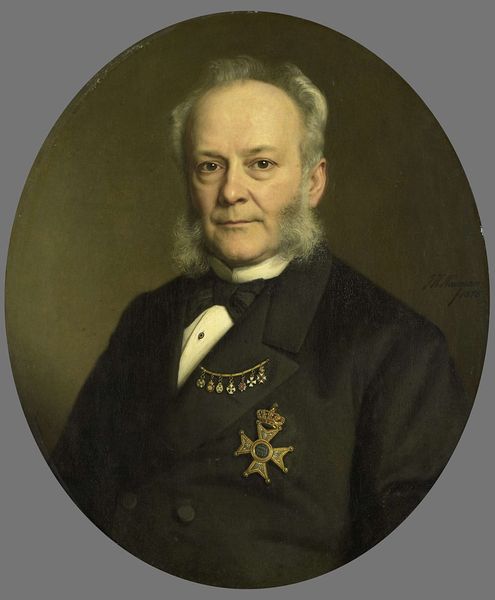Editor: This is a portrait of Jan Jacob Lodewijk ten Kate, painted in 1875 by Johan Heinrich Neuman, using oil paint. I’m immediately struck by his serious expression and formal attire – it feels very proper and almost imposing. What’s your read on this piece? Curator: Well, considering the context of the time, the late 19th century, these commissioned portraits of prominent figures served a very specific function. What do you think that function was? Editor: To document their existence, of course. Maybe to immortalize them, or to showcase their status within society. Curator: Precisely! Portraits like these weren't merely about capturing a likeness, they were powerful statements about the subject's position. Ten Kate was a well-regarded poet. Neuman uses visual language of Romanticism, depicting him in a refined style and somewhat elevated. Think about the burgeoning middle class at this time, seeking validation through these artistic displays. It becomes an act of social climbing. Editor: So the act of painting the portrait is, in itself, a form of endorsing someone’s importance? Curator: Absolutely. The museum display even reinforces that concept. The Rijksmuseum legitimizes not only the sitter, but also the painter. Consider who *doesn't* get their portrait painted, whose stories aren’t visually told in such a way? It raises questions of access, power and visibility. Editor: That makes me look at it in a completely different light! I was just seeing a stern face, but it’s actually tied up in larger social narratives. Curator: Indeed. Art is rarely created or viewed in a vacuum. Hopefully this has encouraged you to consider the political dimensions within even seemingly straightforward portraits. Editor: Definitely, I’ll remember that next time I wander through the portrait gallery. Thank you for sharing that with me.