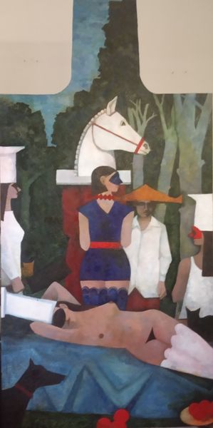 William Balthazar Rose's oil painting presents a tableau vivant where death, personified by a smoking skeleton, holds court amidst an assembly of figures. The skeleton, clad in red, immediately evokes the medieval "Danse Macabre," where death is an active participant in life, not just an end. Here, it sits, a judge perhaps, puffing on a pipe, a symbol of fleeting pleasure. This motif echoes across centuries, reappearing in Northern Renaissance art as a ‘memento mori’ skull, a reminder of mortality. The horse-headed figure, a less conventional symbol, could be interpreted through the lens of ancient carnival traditions, where animal masks blur the lines between human and beast, order and chaos. This potent imagery engages us on a deeply subconscious level. Notice how the artist compels us to recognize how the same symbols resurface, evolving and accumulating new layers of meaning as they traverse through time.